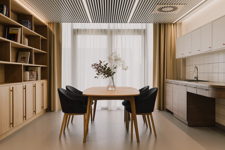 Projektantom pomimo użycia materiałów typowo szpitalnych, udało się stworzyć przytulną atmosferę kojarzącą się bardziej z wakacyjnym wypoczynkiem w rezydencji nad jeziorem niż pobytem w placówce medycznej.