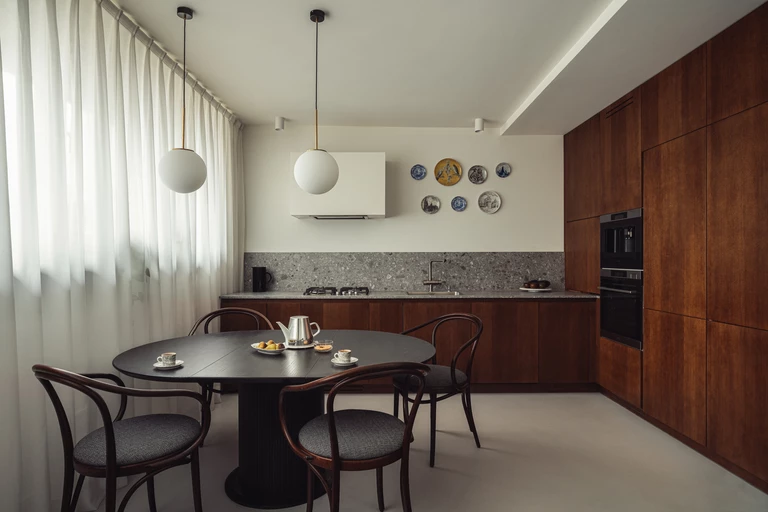 W celu zapewnienia odpowiedniej ilości miejsca do przechowywania w kuchni, łazience i holu umiejscowiono stałe zabudowy meblowe z forniru. Materiał skomponowano z jednolitymi płytkami Ceppo di Gré, które ułożono w łazience i na blacie kuchennym. „Kropką nad i” projektu są piękne talerze z Maison La Revolte, pełniące funkcję dekoracyjną, które powieszono nad ścianie w kuchni.