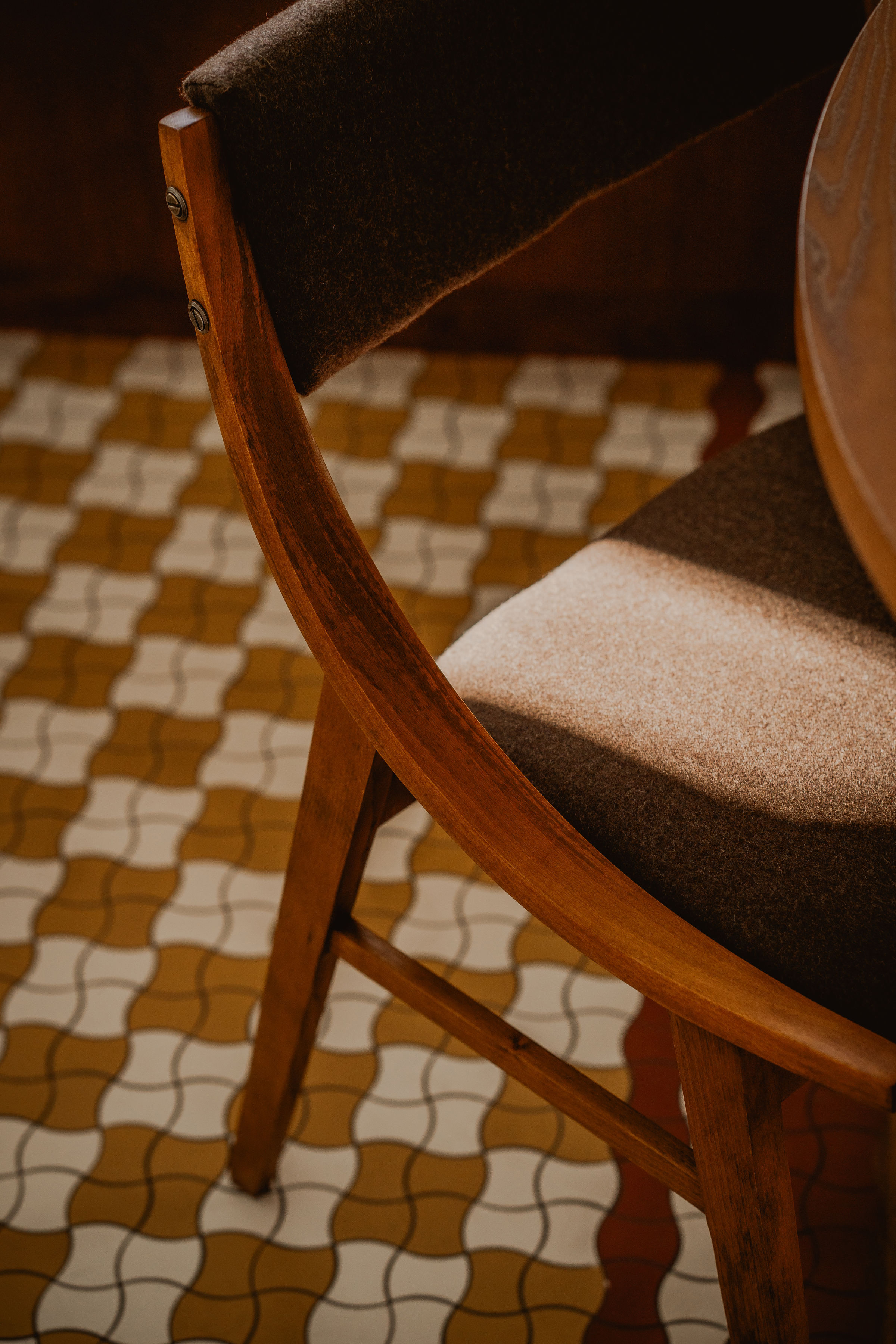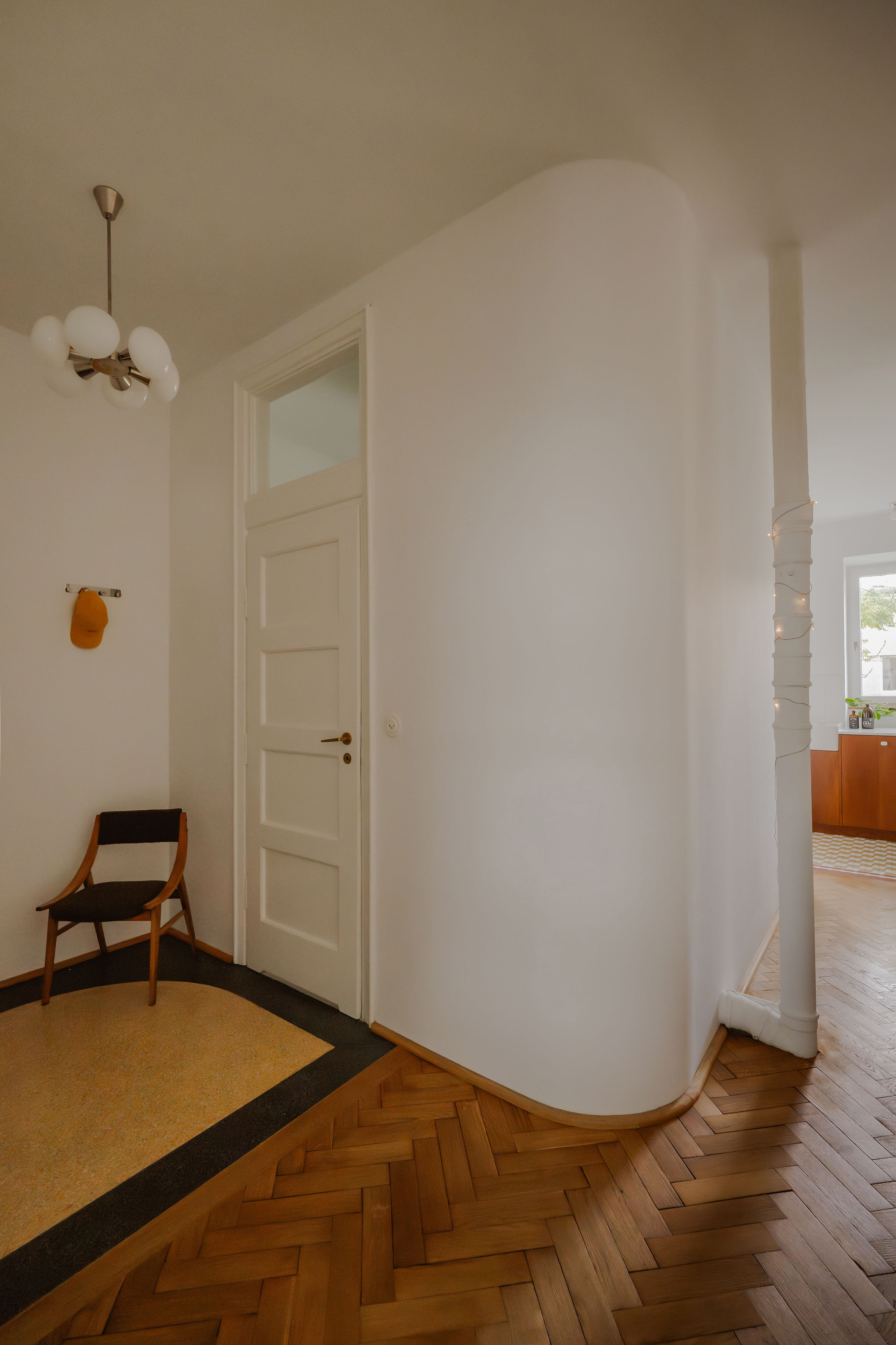 Przy wytyczaniu nowych ścian, pracownia sięgnęła po funkcjonalne odniesienia typowe dla epoki modernizmu. Wprowadzono charakterystyczne zaoblenia narożników, a sam bieg ścian w holu wejściowym zaakcentowano wizualnym detalem na posadzce.
