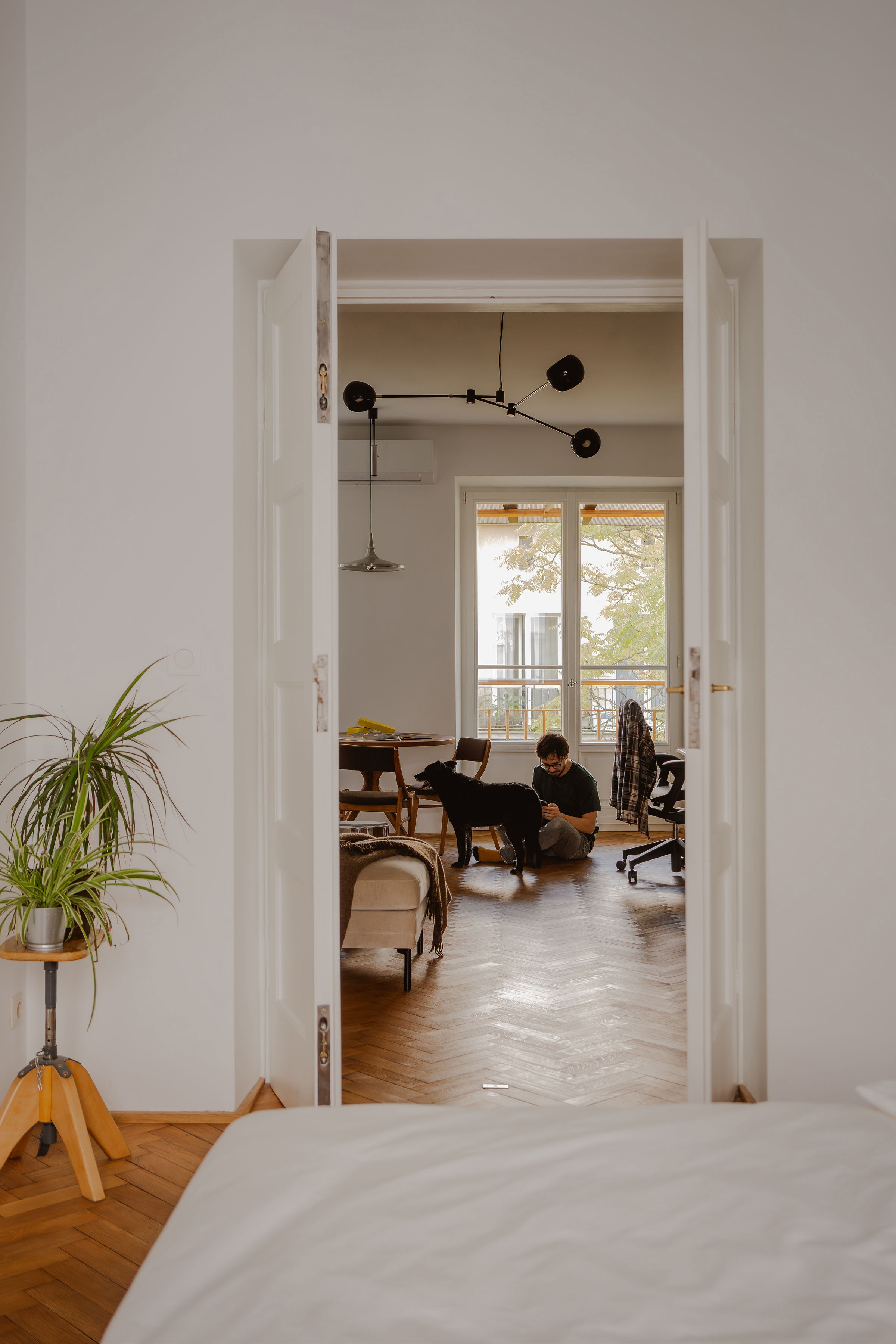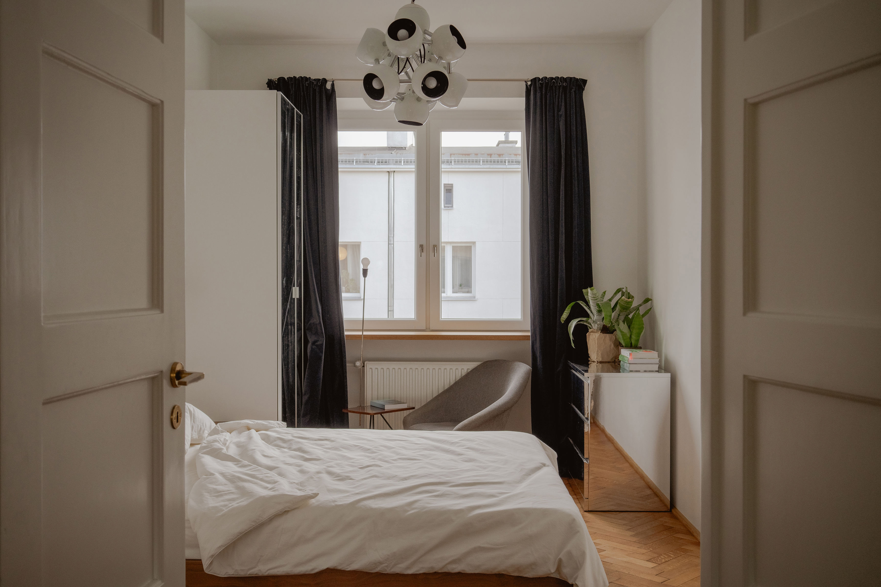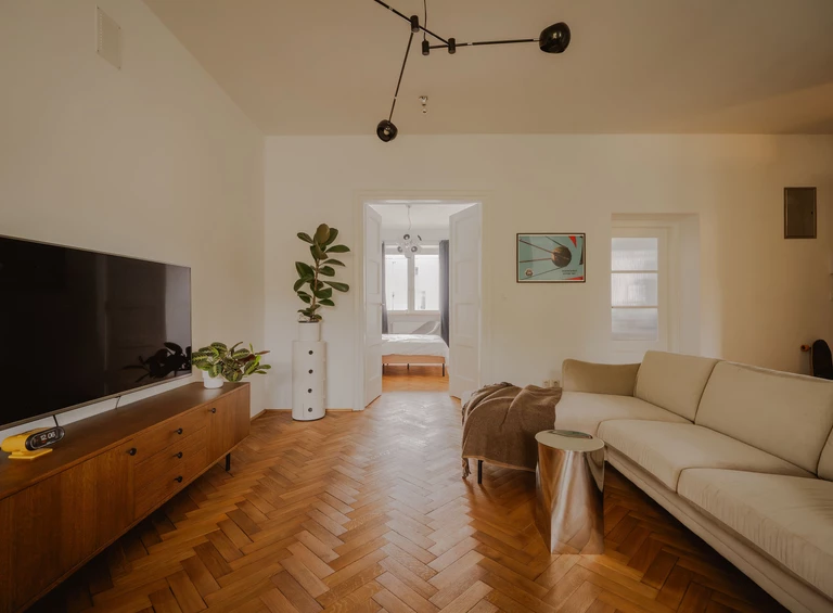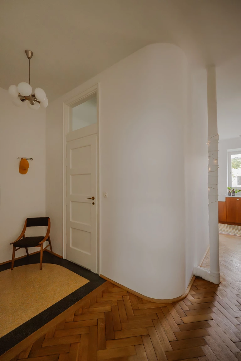 Renowacji poddano oryginalny parkiet oraz stolarkę drzwiową. Tę ostatnią twórczo zmodernizowano: dawne ościeżnice drzwi łazienkowych rozbudowano o naświetle, wpuszczając dodatkowe naturalne światło do holu.