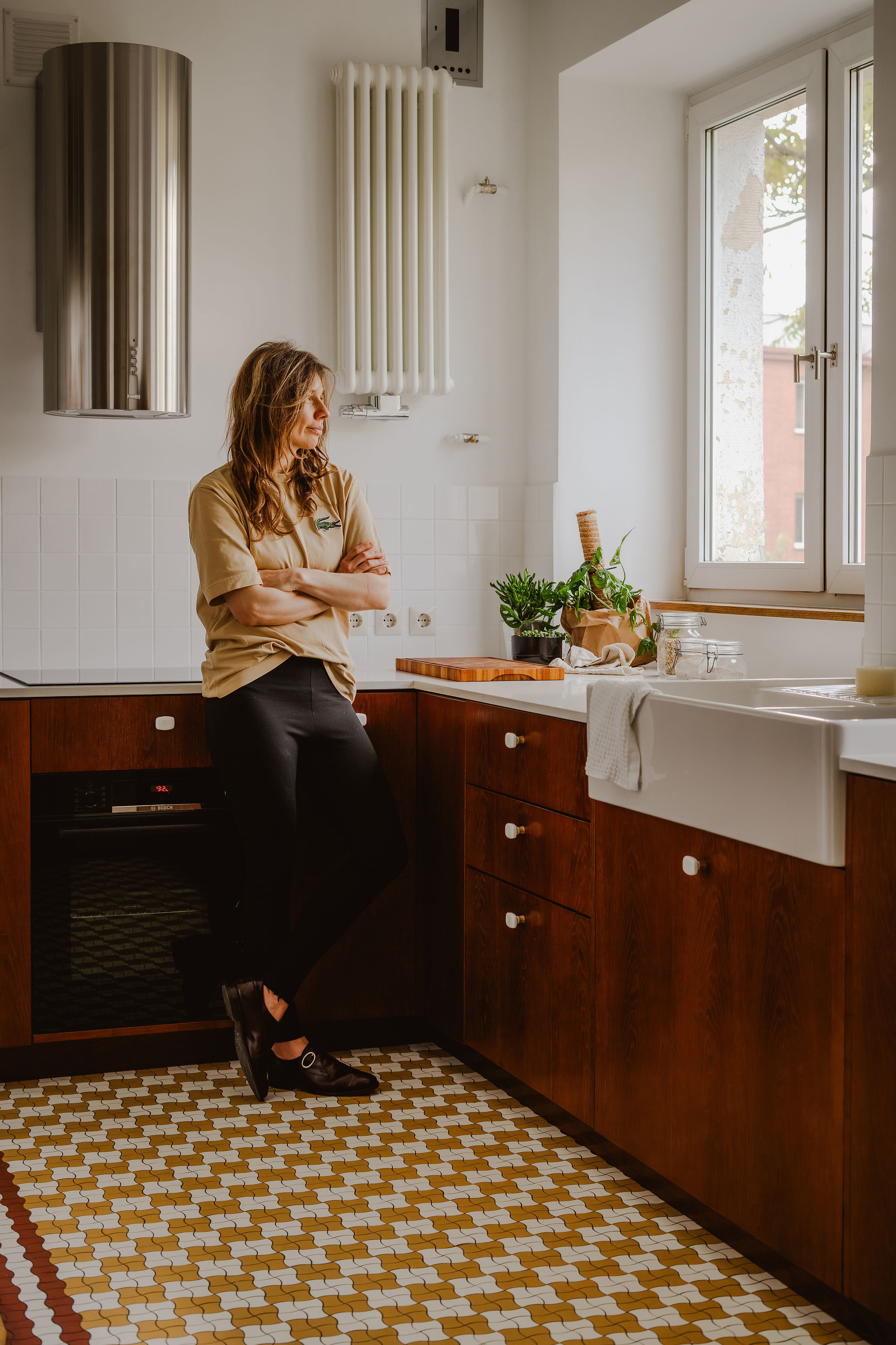 Jest nim odlany z lastryko łuk, precyzyjnie wpasowany we wzór podłogi, wykonany w ulubionym kolorze właścicieli. Ten element był efektem ścisłej współpracy z rzemieślnikami z firmy Bruto, którzy pomogli w montażu ciężkich płyt na wymiar na specjalnie usztywnionych legarach.