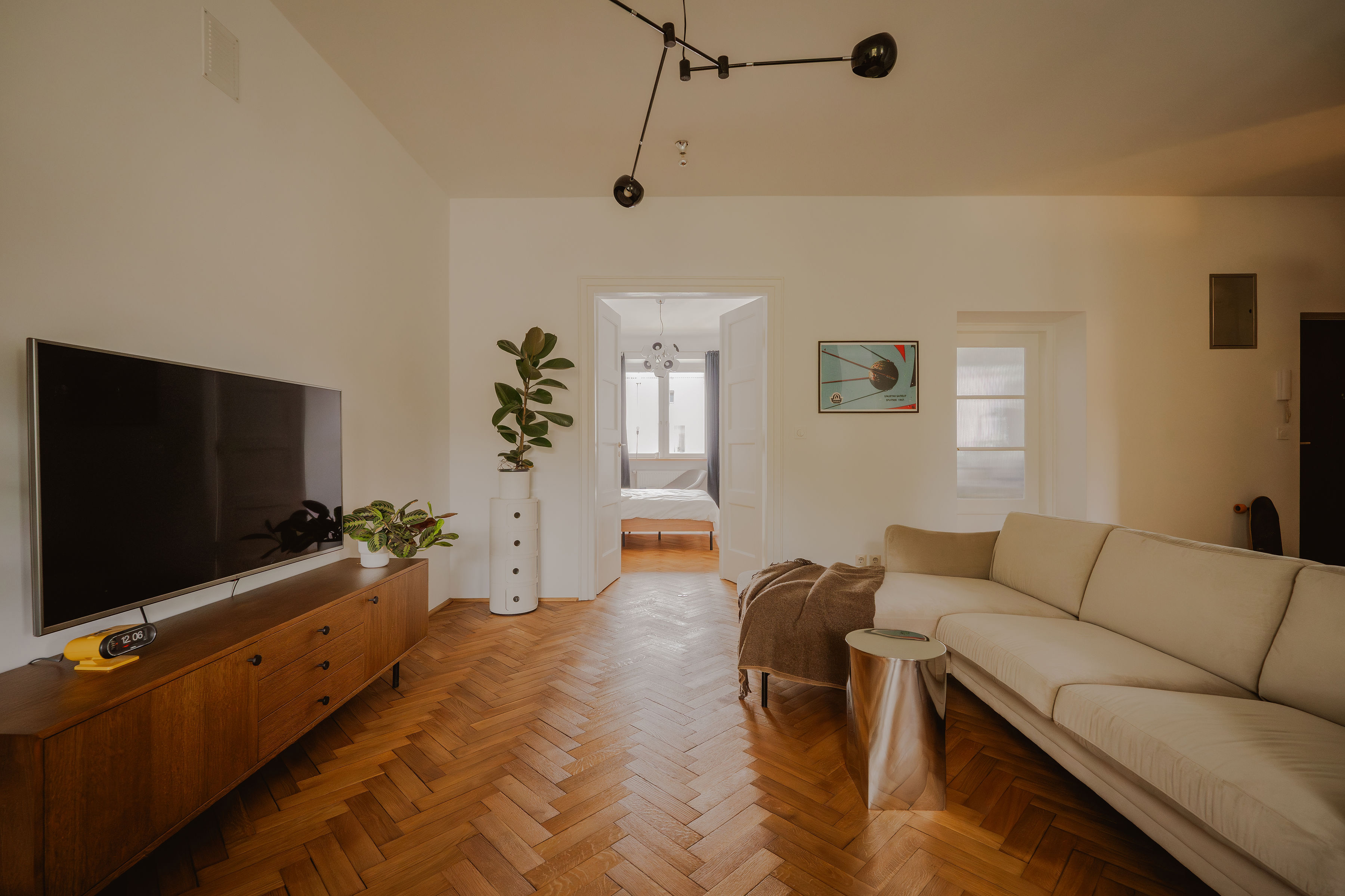 Nowe elementy wyposażenia świadomie zestawiono z perełkami vintage, wyszukanymi na aukcjach. Biurko Szymona, wykonane z wysokiej jakości sklejki przez polską markę Plywood Project, rezonuje formą z odrestaurowanymi, kultowymi fotelami "skoczkami" z Zamojskiej Fabryki Mebli (lata 70.). Obok nowej sofy o zaoblonych podłokietnikach (Mti Furninowa) stanął lekki, stalowy stolik z Zara Home, dopełniając eklektycznego charakteru wnętrza.