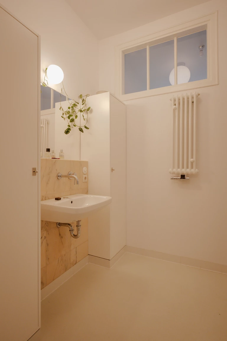 W doborze materiałów postawiono na naturalność. W łazience, przy umywalce, zastosowano marmur Rosa Portugal w ciepłych odcieniach, które pięknie współgrają ze światłem wpadającym przez odnowiony świetlik.