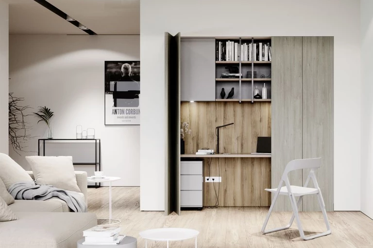 Salon z kącikiem homeoffice zamykanym za rozsuwanymi frontami. Dekory zastosowane w projekcie to: Dąb Lorenzo R20256, Dąb Retro R20372 oraz Szarość Delfina U12044