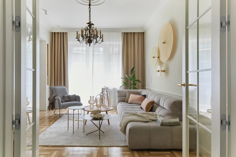Architektki zdecydowały się zachować funkcjonalny rozkład mieszkania, w którym mieści się duża kuchnia połączona z jadalnią, gabinet, salon z przejściem do sypialni, hol, łazienka oraz wc. Przyjazną, ciepłą aurę wnętrze zawdzięcza naturalnym materiałom, takim jak drewno, rattan czy kamień, jak również starannie wyselekcjonowanym kolorom – ciepłym odcieniom bieli, szarości i beżów. Francuski klimat podkreśla także ozdobna sztukateria na ścianach i suficie.