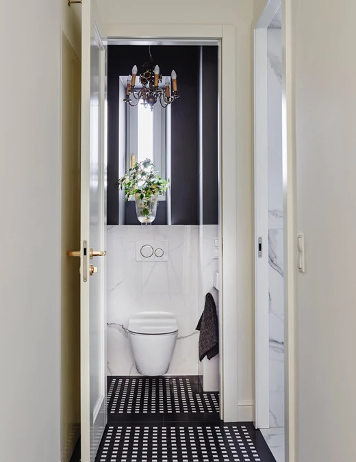 Zarówno łazienka, jak i wc zostały zaprojektowane w minimalistycznym stylu. Architektki zdecydowały się na wykorzystanie płytek ceramicznych przypominających kararyjski marmur.