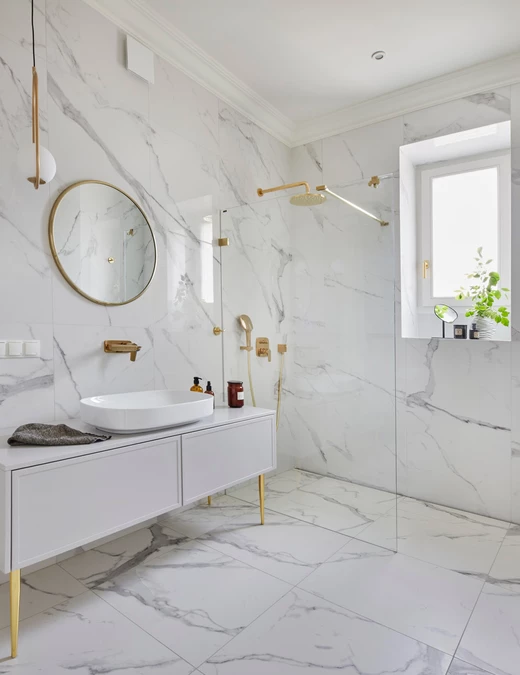Kompozycję dopełniają złote dodatki pasujące kolorystycznie do armatury i okuć prysznica oraz gustowne przyciski Geberit Sigma w białym połysku z elementami złocenia. Odważnym, mocnym kolorystycznie akcentem są płytki zastosowane na podłodze. Całość okraszono przyjemnym dla oczu oświetleniem.