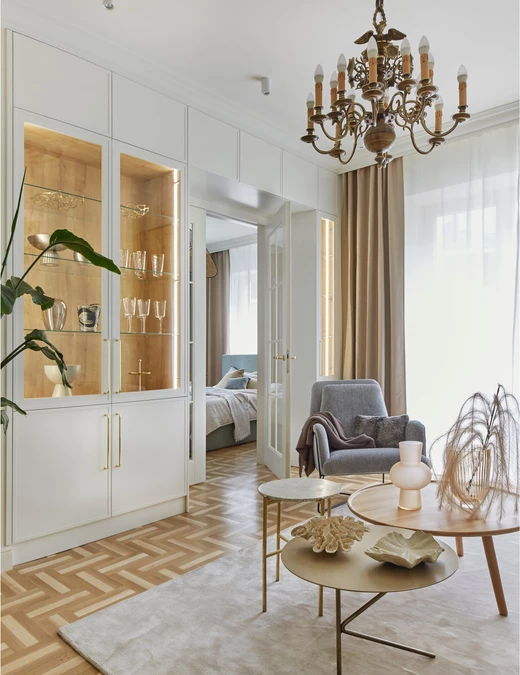 W salonie, na ścianie z drzwiami prowadzącymi do sypialni architektki zaprojektowały delikatne, ale pojemne szafy. Dodatkowej lekkości dodaje zabudowie podświetlana witryna i dekoracje ze złotymi akcentami. Ściany w kolorze złamanej bieli przełamuje wzorzysty parkiet i obita pluszem kanapa „Alice” od Nobonobo w srebrnoszarym odcieniu.