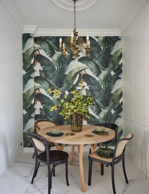 Za pomocą wzorzystej, efektownej tapety w liście bananowca oddzielono wizualnie jadalnię od kuchni. Okrągły, dębowy stół otaczają modne krzesła z rattanową plecionką. W wąskiej przestrzeni udało się zmieścić także płytką zabudowę ukrywającą grzejnik oraz słupek. Dzięki frontom szafek nawiązującym do sztukaterii szafa przypomina panele boazeryjne i doskonale pasuje do wnętrza mieszkania. Kuchnię cechuje przytulność i minimalizm. Dzięki braku górnej zabudowy pomieszczenie wydaje się lżejsze, jaśniejsze i bardziej przestronne.