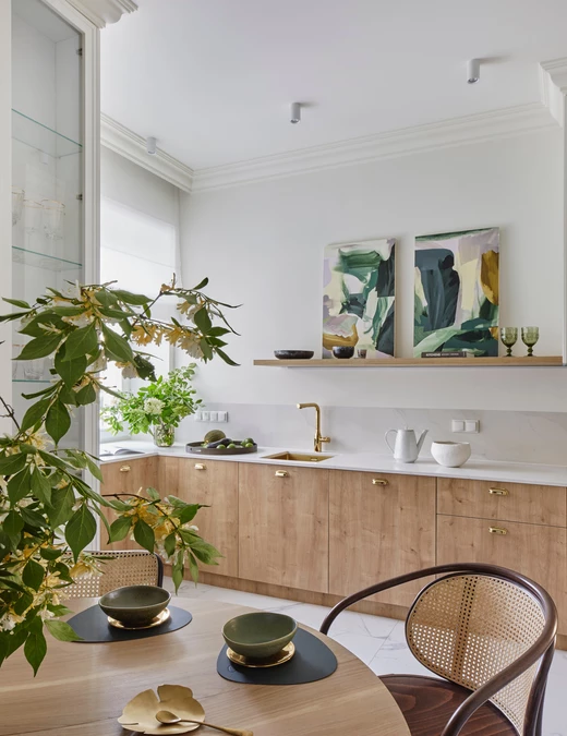– Dzięki dużej swobodzie, którą otrzymałyśmy od właściciela mieszkania, mogłyśmy same wybrać kierunek podczas projektowania. Wnętrze kamienicy zachwyciło nas swoim artystycznym, lekko francuskim klimatem. Chciałyśmy wydobyć jak najwięcej słonecznego ciepła, dlatego zdecydowałyśmy się na wykorzystanie dużej ilości drewna i naturalnych kolorów. Śmietanowy odcień ścian stanowi doskonałą bazę dla mebli, zarówno tych współczesnych, jak i tych w stylu modern classic. Całość dopełniają złote dodatki zauważalne w całym mieszkaniu – mówią Maria Wilk-Zadrożna i Agata Izdebska z pracowni M.A. Kolektyw.
