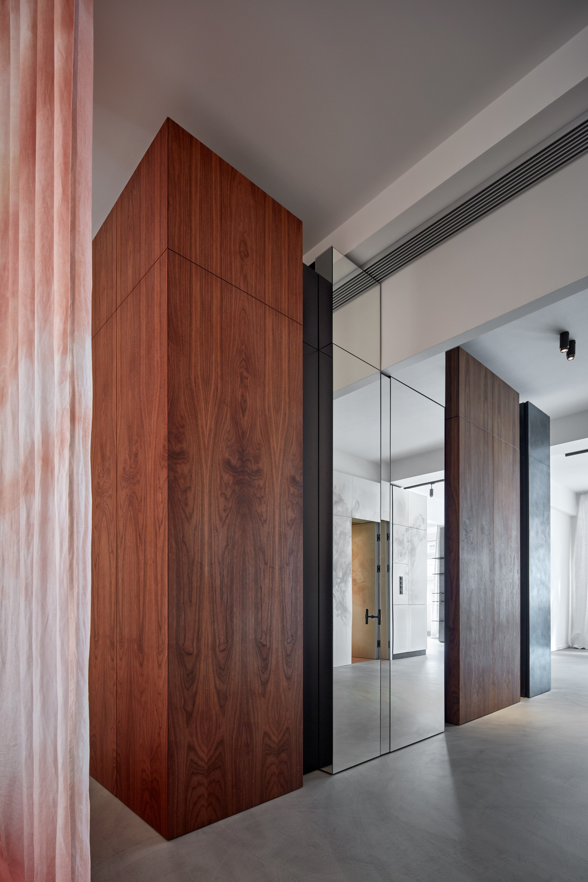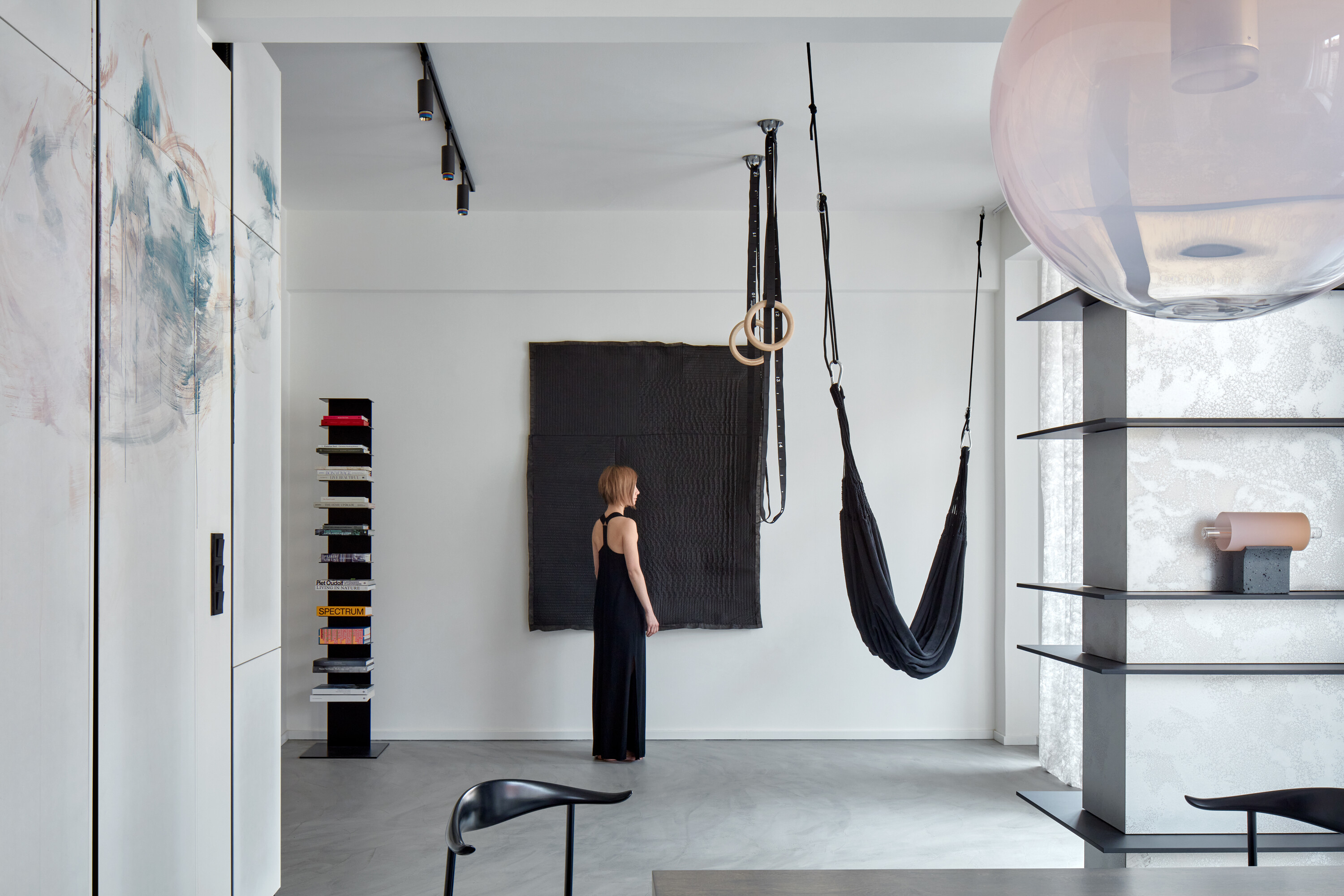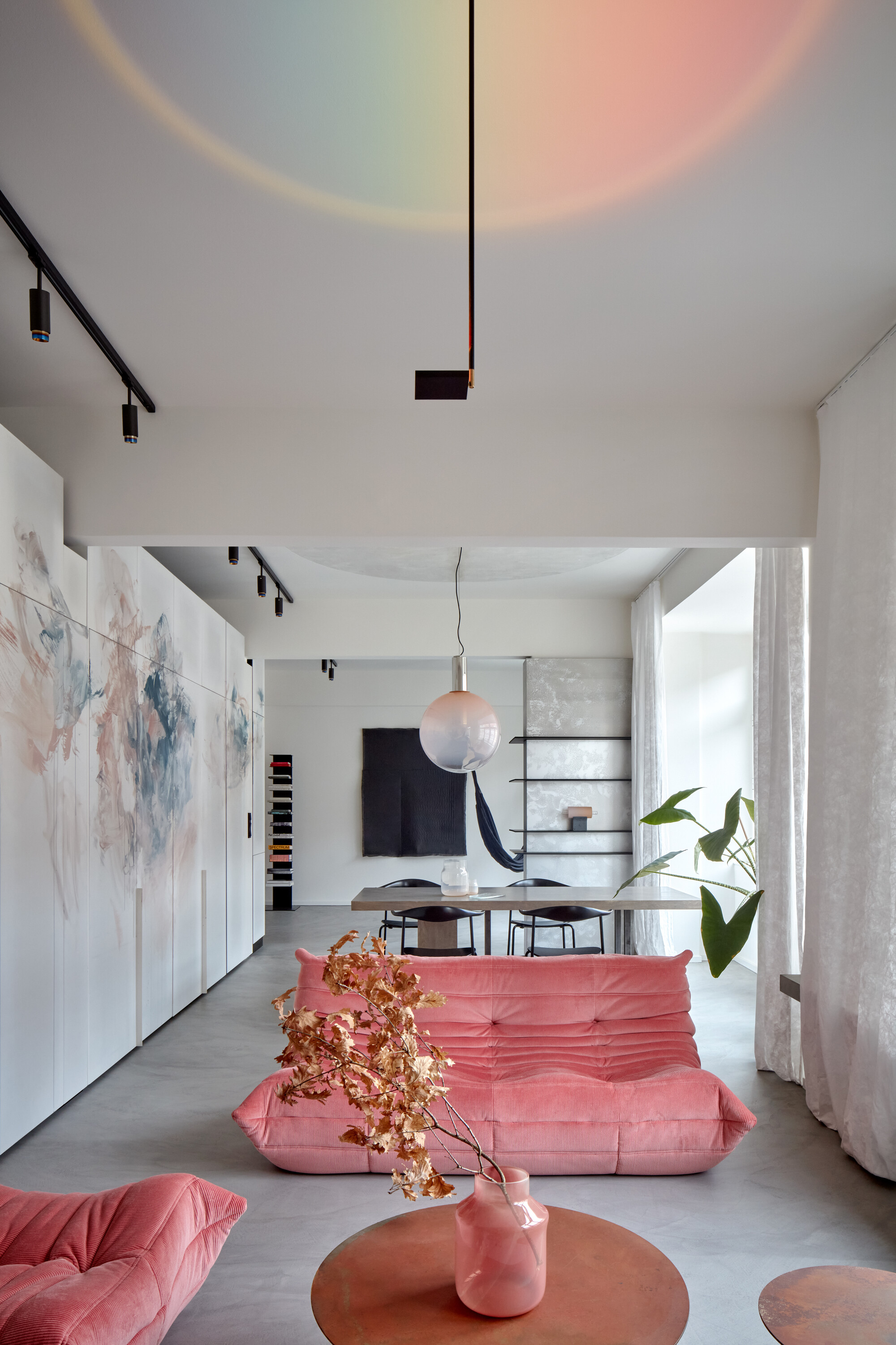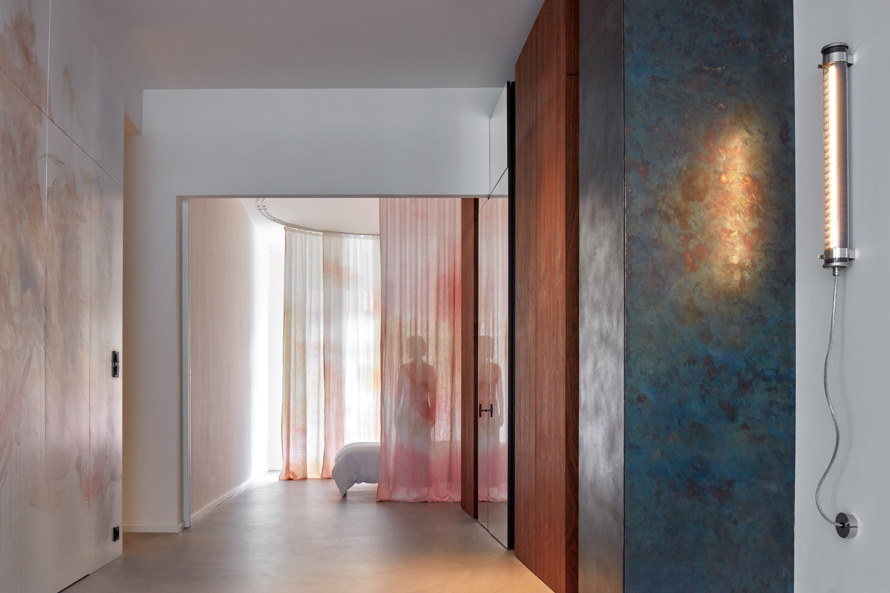 Koncepcja aranżacji opiera się na dialogu między surowością a miękkością. Delikatne odcienie różu, moreli i karmazynu, obecne na sofach Ligne Roset oraz zasłonach w sypialni, sąsiadują z surowymi metalami takimi jak trawione aluminium, stal nierdzewna i oksydowana blacha. W sypialni lniane tekstylia otaczają łóżko, subtelnie barwiąc wpadające do środka światło i tworząc intymną strefę, którą można oddzielić od reszty domu za pomocą mobilnej ścianki.