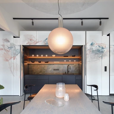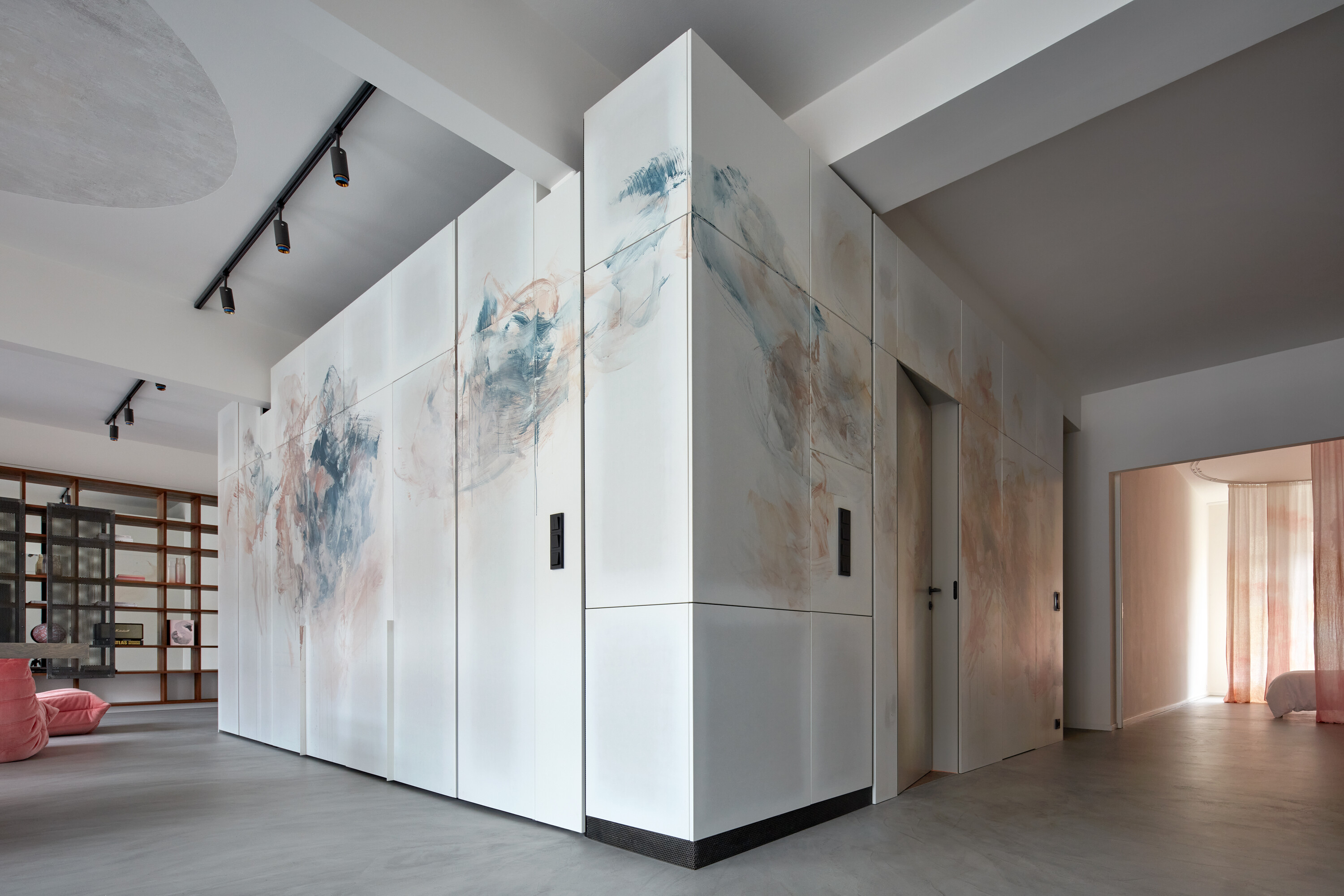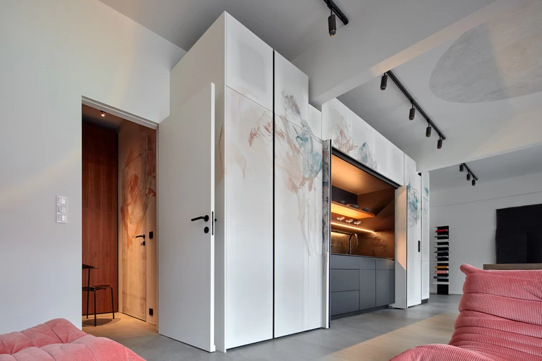 Ta wielkogabarytowa bryła koncentruje w sobie wszystkie niezbędne funkcje: strefę wejściową, pomieszczenia gospodarcze, garderobę oraz kuchnię ukrytą za składanymi drzwiami. Masa meblowa mieści w sobie również dwie łazienki, a jej zewnętrzne ściany stały się płótnem dla malarstwa Klary Spiškovej. Kontrast między surową płytą MDF a ekspresyjną sztuką nadaje wnętrzu energię, podczas gdy reszta apartamentu zachowuje galeryjny, niemal ascetyczny charakter.