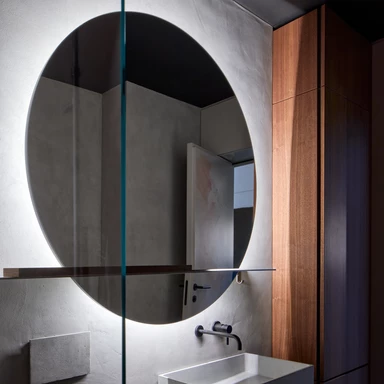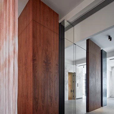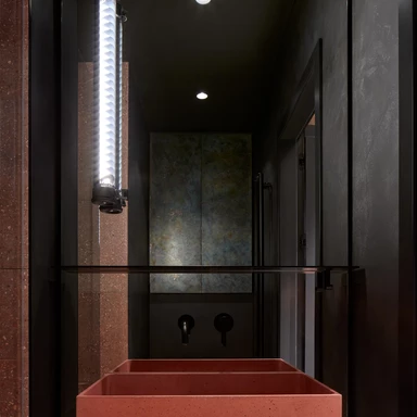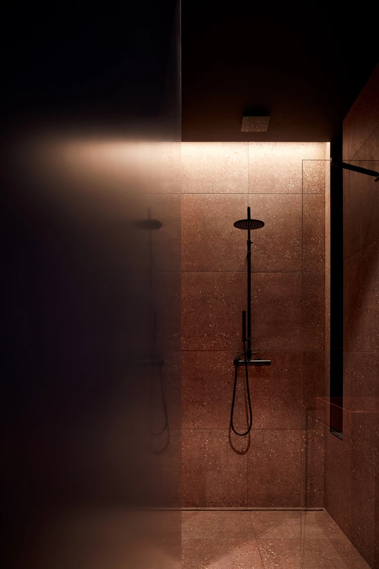 Wnętrze bloku meblowego zaprojektowano w ciemniejszych barwach, które w łazienkach przechodzą w ciepłe tony terakoty i cegły. Całość projektu kładzie nacisk na spójność materiałową i wizualną, wykorzystując długie osie widokowe oraz lustrzane odbicia do optycznego pogłębienia przestrzeni. Apartament E19 to przykład harmonijnego połączenia rzemieślniczej precyzji z artystyczną swobodą, gdzie każdy detal służy budowaniu unikatowej opowieści o miejscu i jego mieszkańcach.