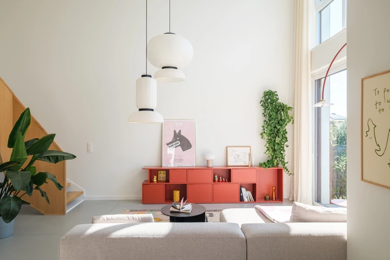 Kluczowym materiałem aranżacji jest jasny fornir, który w połączeniu z białymi ścianami i betonowymi elementami tworzy stonowaną bazę. Unikalny styl przestrzeni nadają wyraziste akcenty kolorystyczne w odcieniach żółci, pomarańczu, różu i cegły.