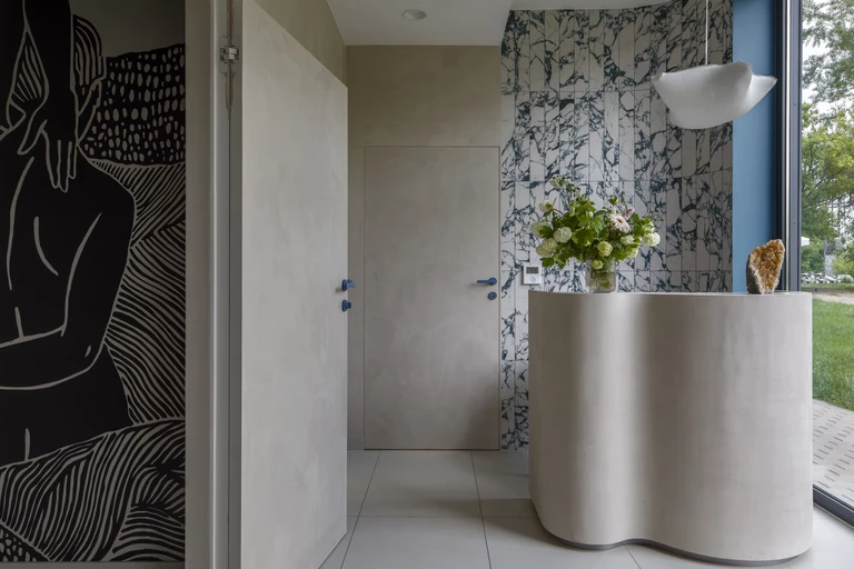 Ciekawym rozwiązaniem są drzwi z ukrytą ościeżnicą, które wykończono tynkiem dekoracyjnym – w ten sposób zlewają się one ze ścianą i nie „kradną” uwagi w tej małej przestrzeni. Podkreślono je jedynie niebieskimi klamkami, które zgrały się kolorystycznie ze wzorem płytek w recepcji.