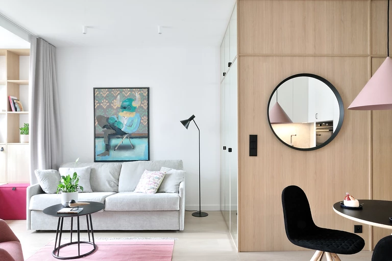 Przez wnętrze przetacza się soczysty róż obecny w tkaninie tapicerowanej.