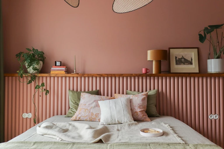 Ścianę i zagłówek z cementowych paneli pomalowano odporną na wycieranie farbą w różowo-łososiowym kolorze NCS S 3020-Y70R uzyskanym na zamówienie z mieszalnika.