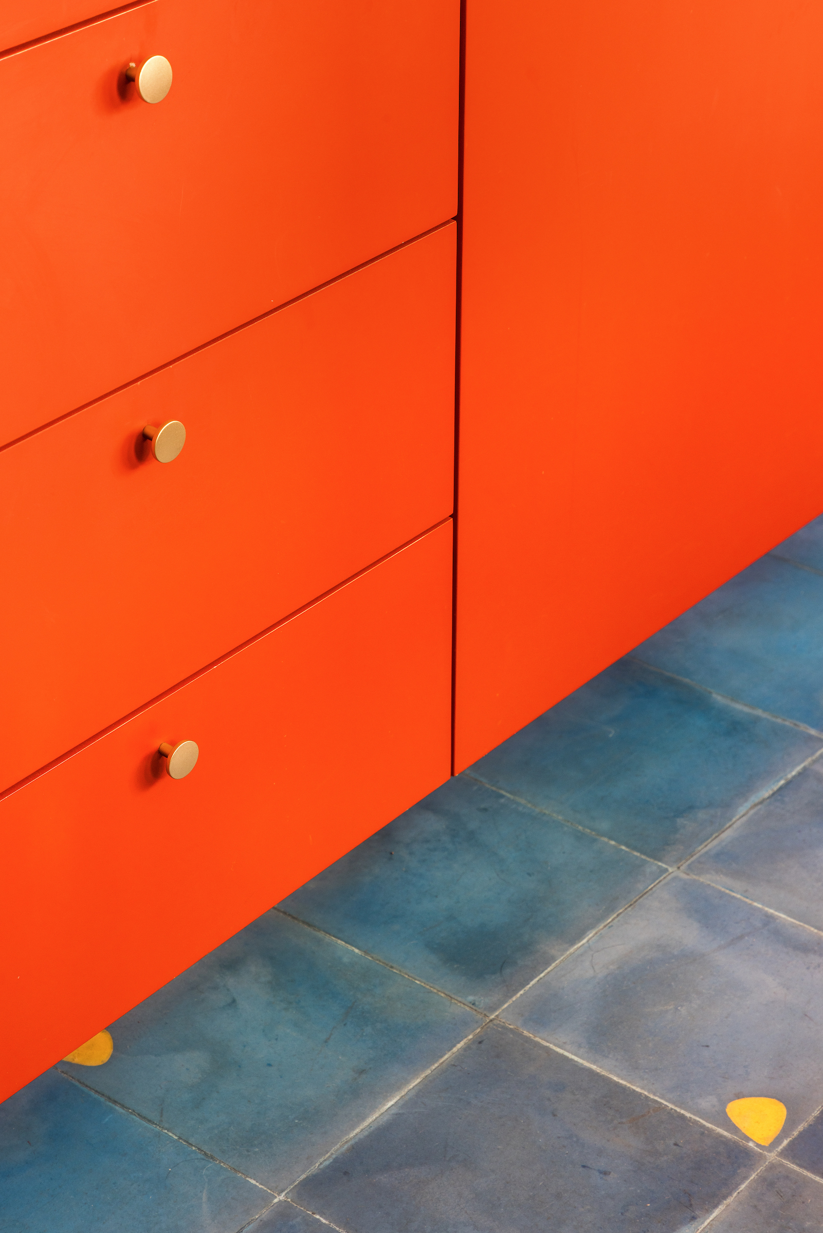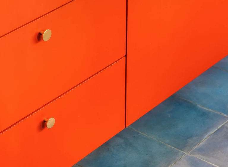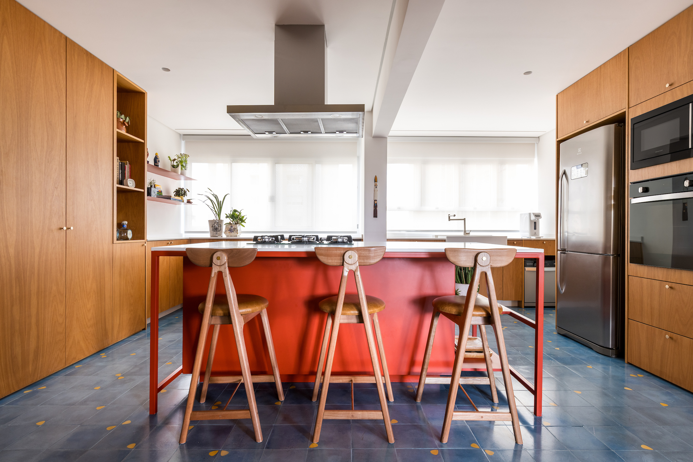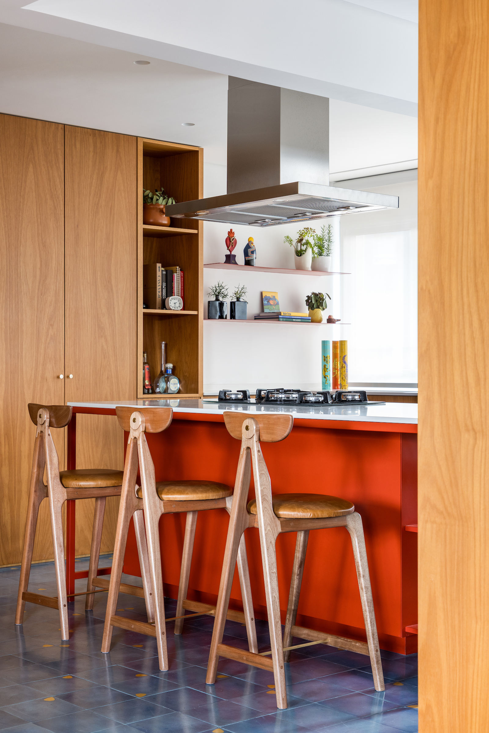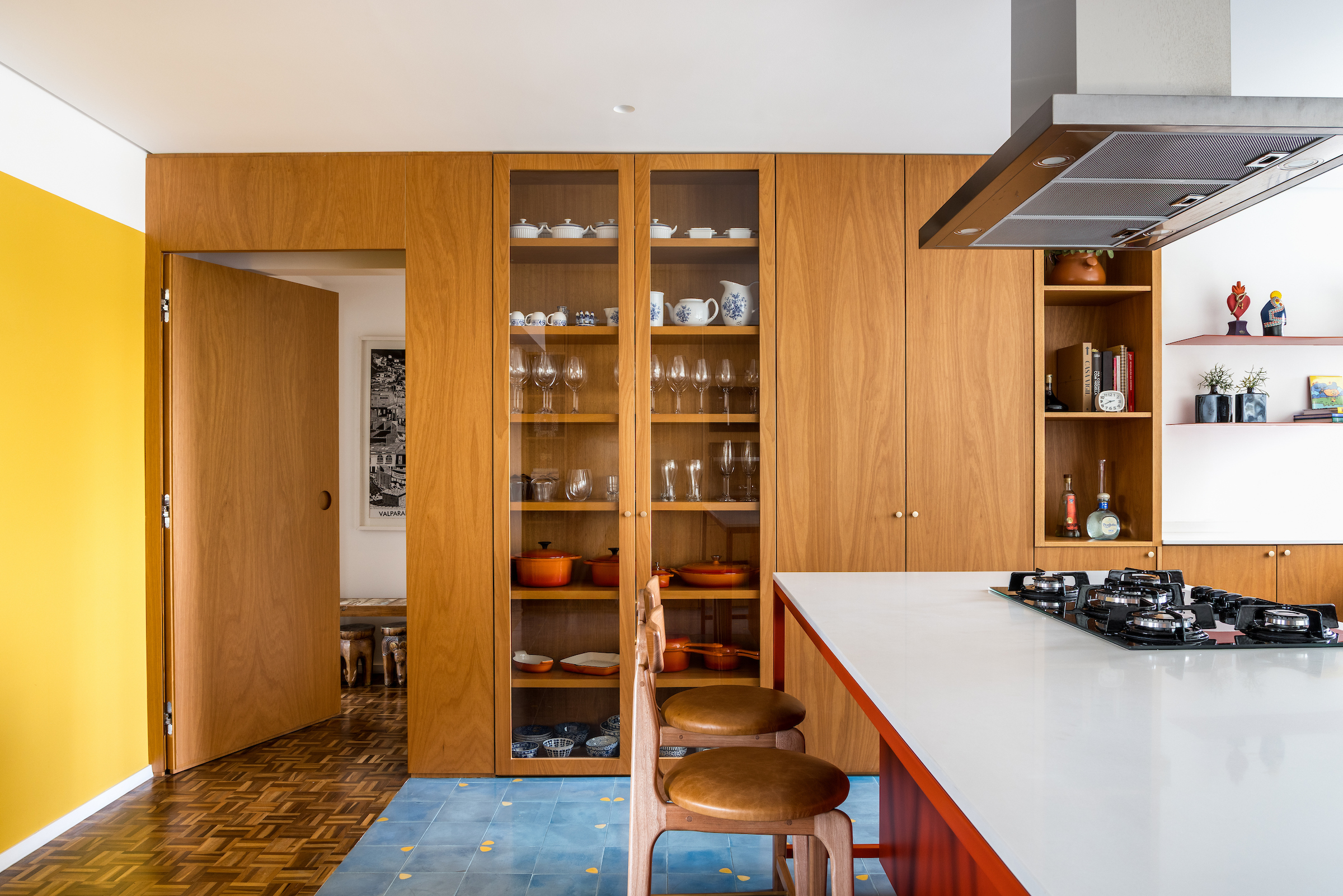 Kuchnia została zaprojektowana jako wyraźny punkt odniesienia dla całego mieszkania. Niebieska podłoga z tradycyjnych płytek hydraulicznych tworzy efektowną grę z wyspą wykonaną z czerwonej stali. Aby jednak zachować wizualną spójność ze strefą społeczną, przestrzeń tę otulają drewniane panele i zabudowa meblowa, wzmacniając poczucie ciepła i domowej przytulności. Efektem jest radosne i funkcjonalne środowisko, idealne zarówno do codziennego życia, jak i wieczornych kolacji z przyjaciółmi.