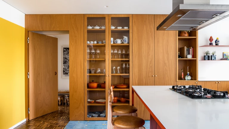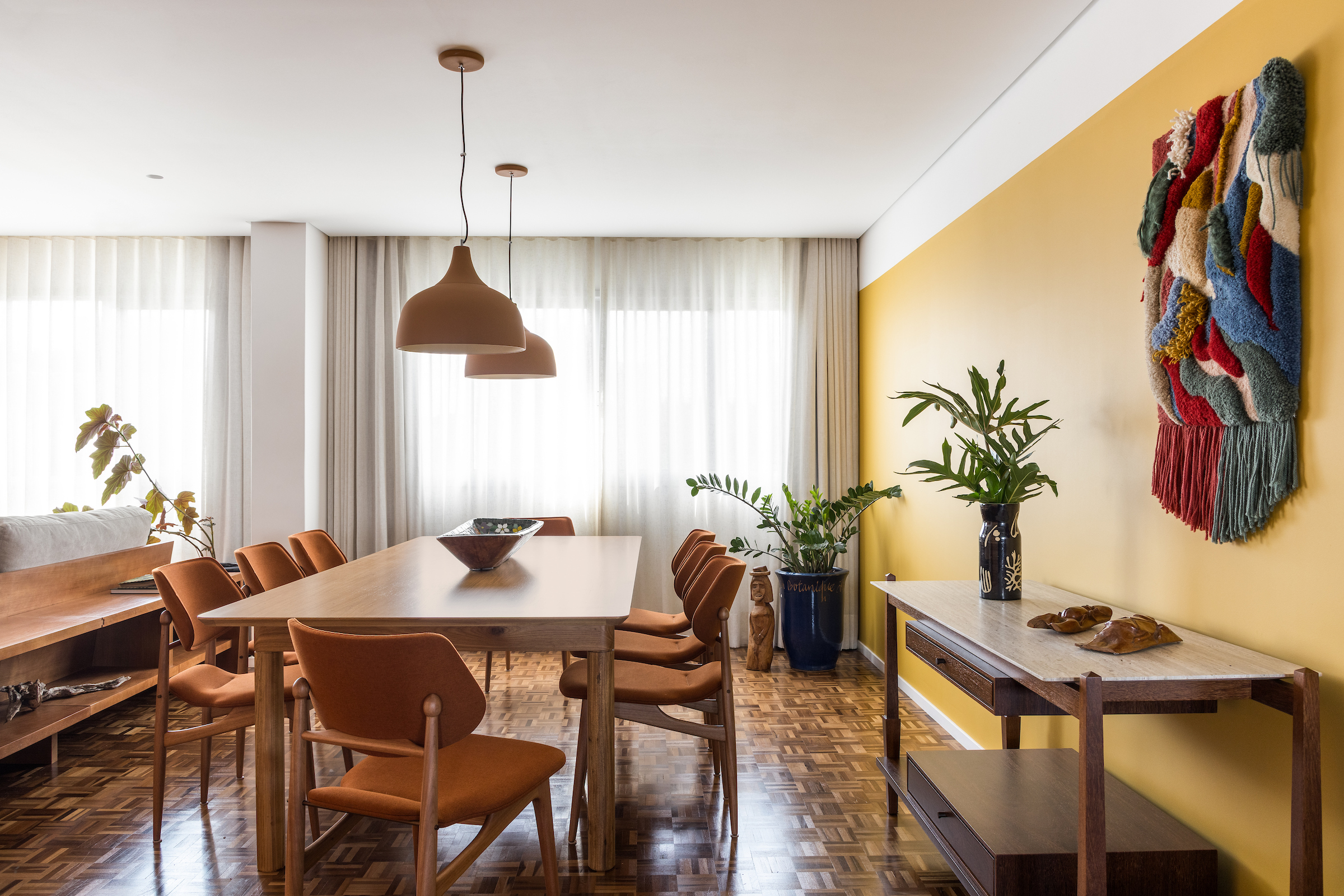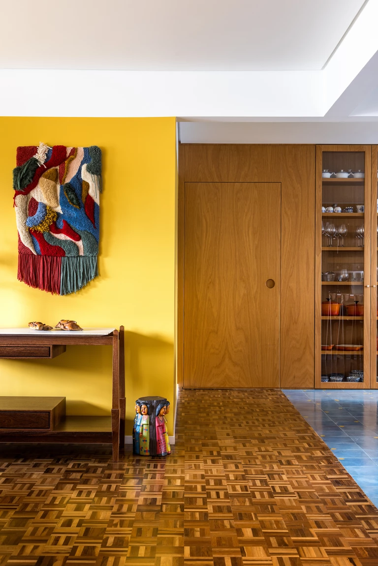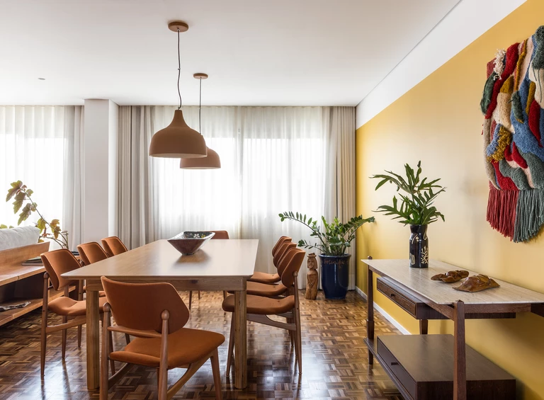 Apartament o powierzchni 150 m², zaprojektowany przez pracownię Küster Brizola Arquitetos, to misterna kompozycja barw, faktur i dzieł sztuki, która w nowoczesny sposób interpretuje fundamenty brazylijskiej architektury modernistycznej.