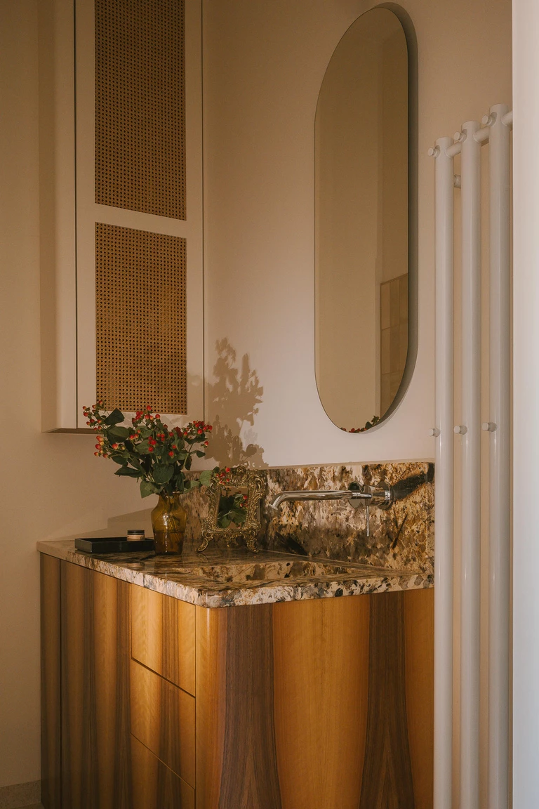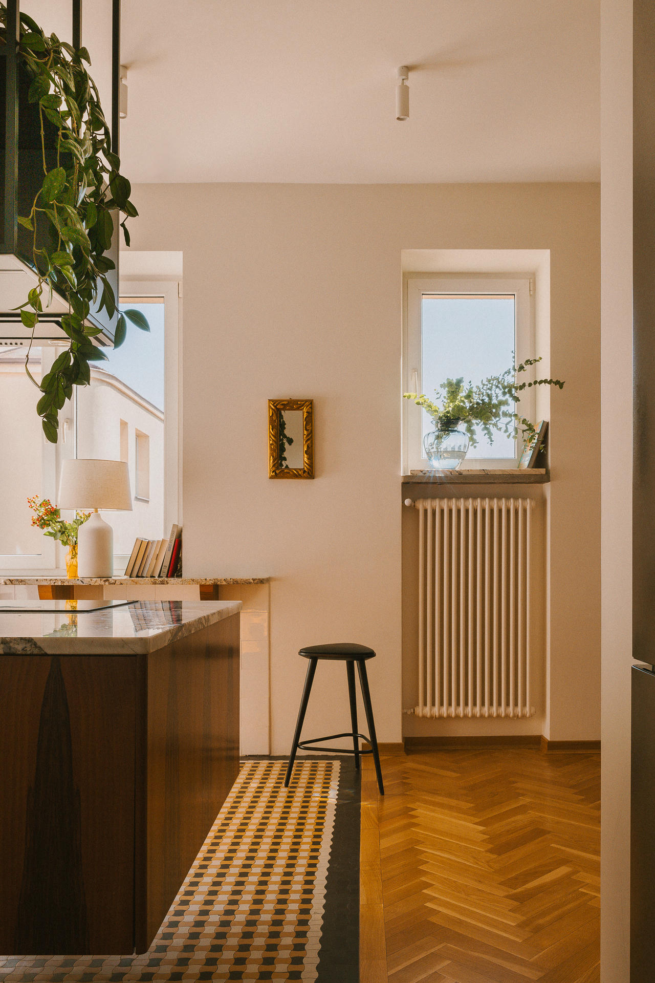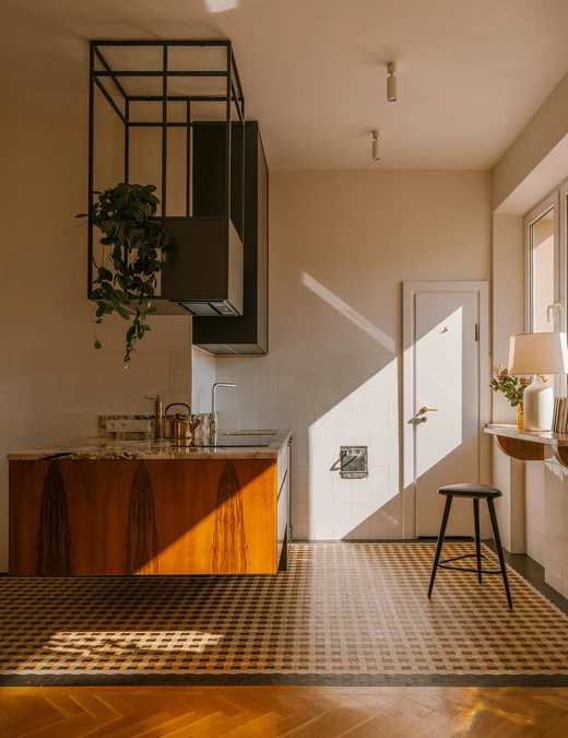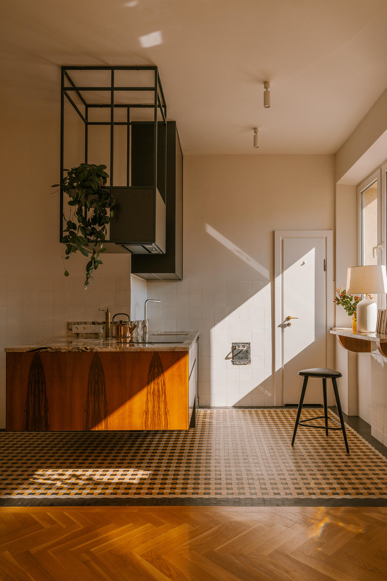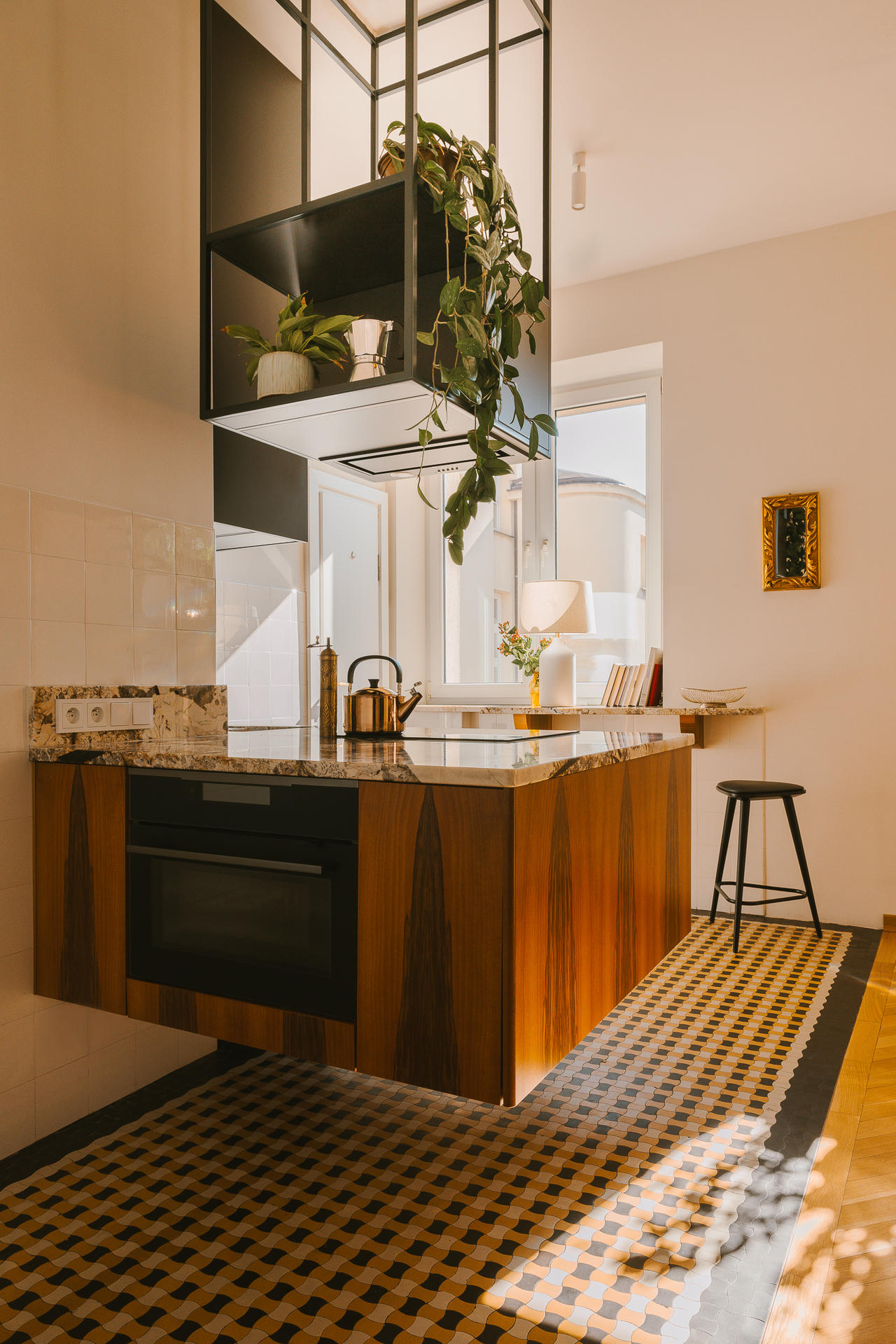 Centralnym punktem mieszkania jest kuchnia, gdzie uwagę przyciąga rzeźbiarski mebel kuchenny, który został częściowo podwieszony. Zabieg ten pozwolił wyeksponować oryginalną mozaikę na podłodze. Część gorsecików wymagała wymiany, ale architektce udało się pozyskać kafle o identycznym kształcie i kolorze, a doświadczony glazurnik wymienił je tak precyzyjnie, że różnica pozostaje niemal niewidoczna.