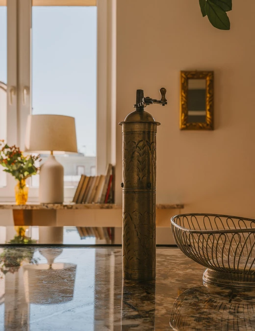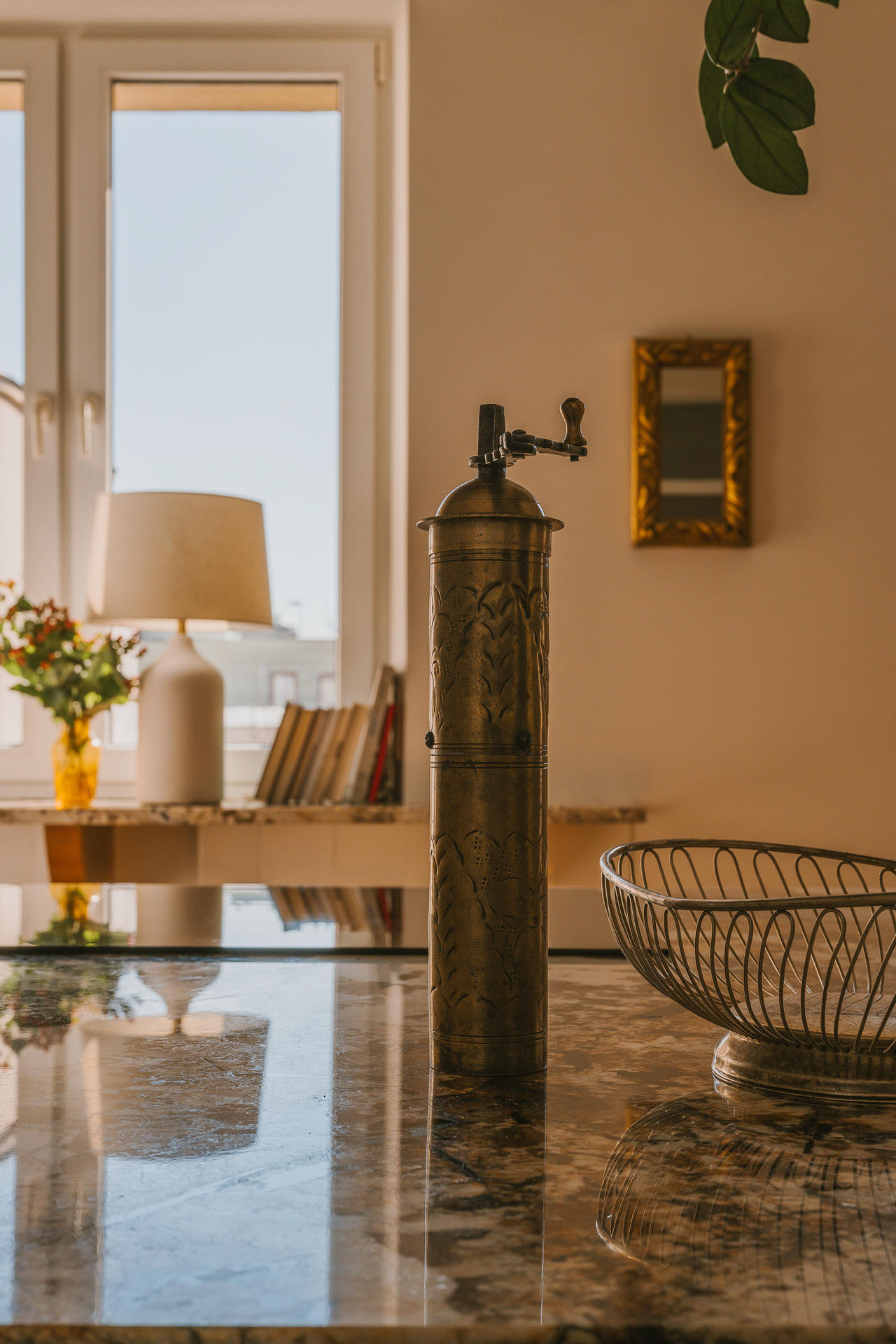 Nad półwyspem zaprojektowano stalową konstrukcję z półkami na zioła i akcesoria kuchenne oraz zabudowaną szafką kryjącą pochłaniacz, a przy wejściu do spiżarni zachowały się żeliwne drzwiczki dawnego zsypu – dziś już nieczynnego, ale przypominającego o standardzie kamienicy.