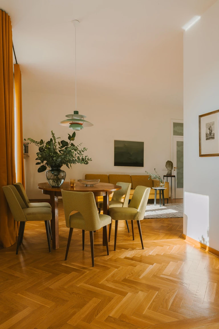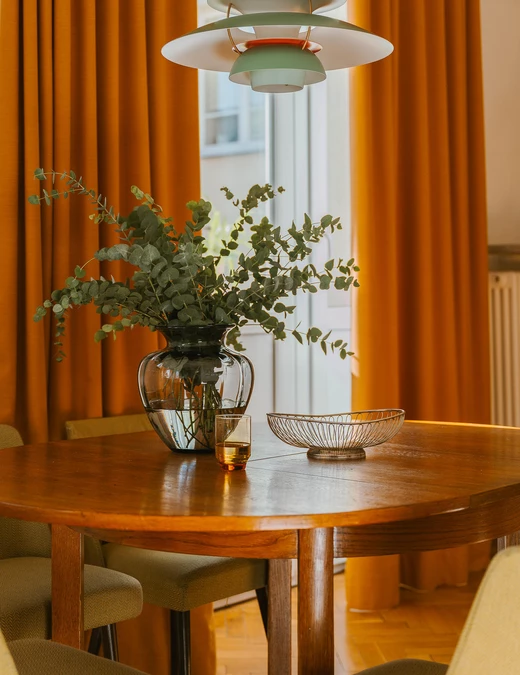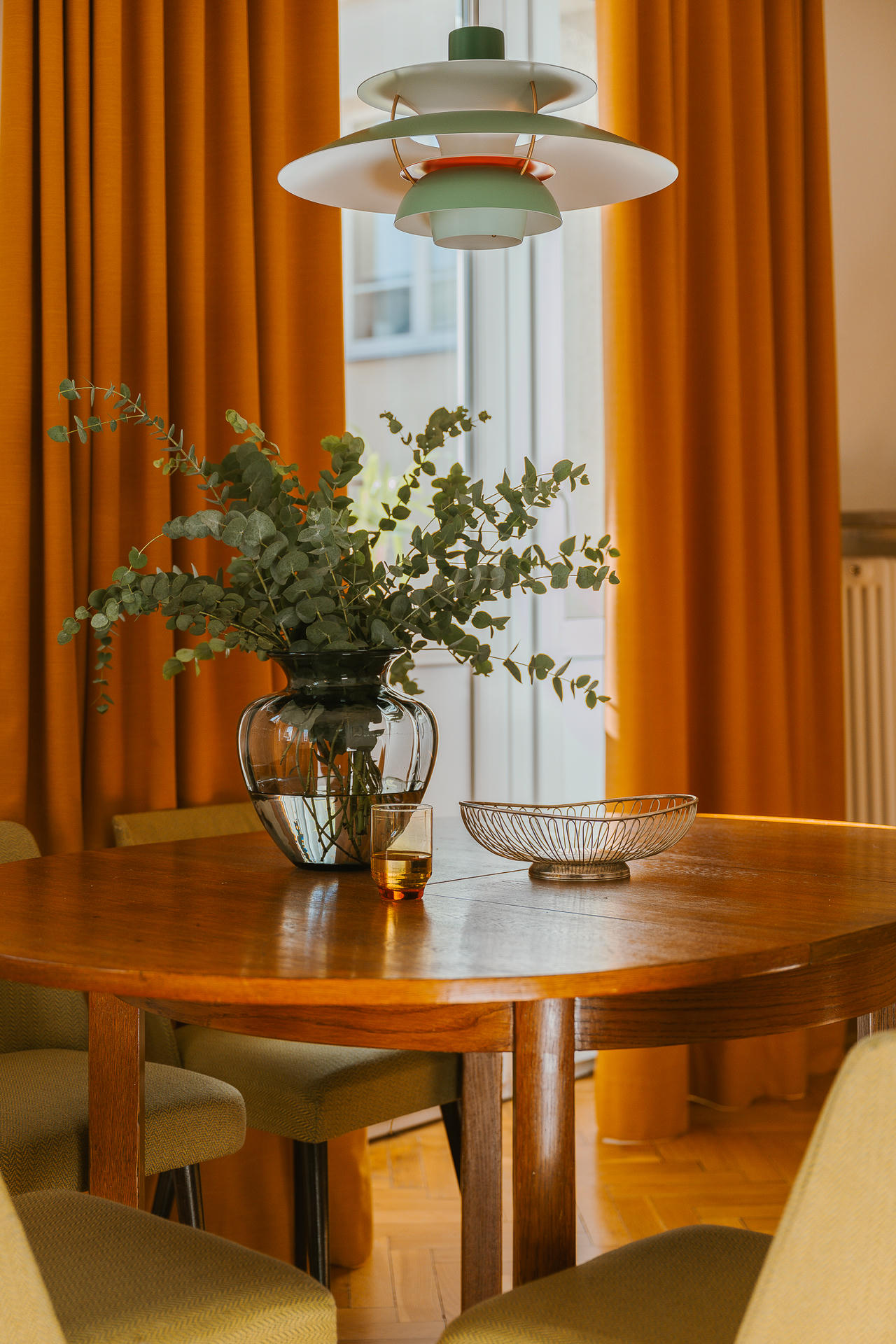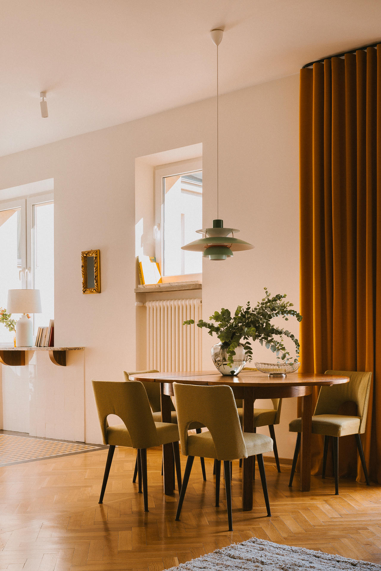 Stół w jadalni pochodzi z aukcji mebli vintage, podobnie jak tapicerowane krzesła z lat 60. Ich forma nawiązuje do modernistycznych eksperymentów polskiego wzornictwa powojennego – projektu „Muszelka” Teresy Kruszewskiej. Nad stołem zawisła ikoniczna duńska lampa PH 5.