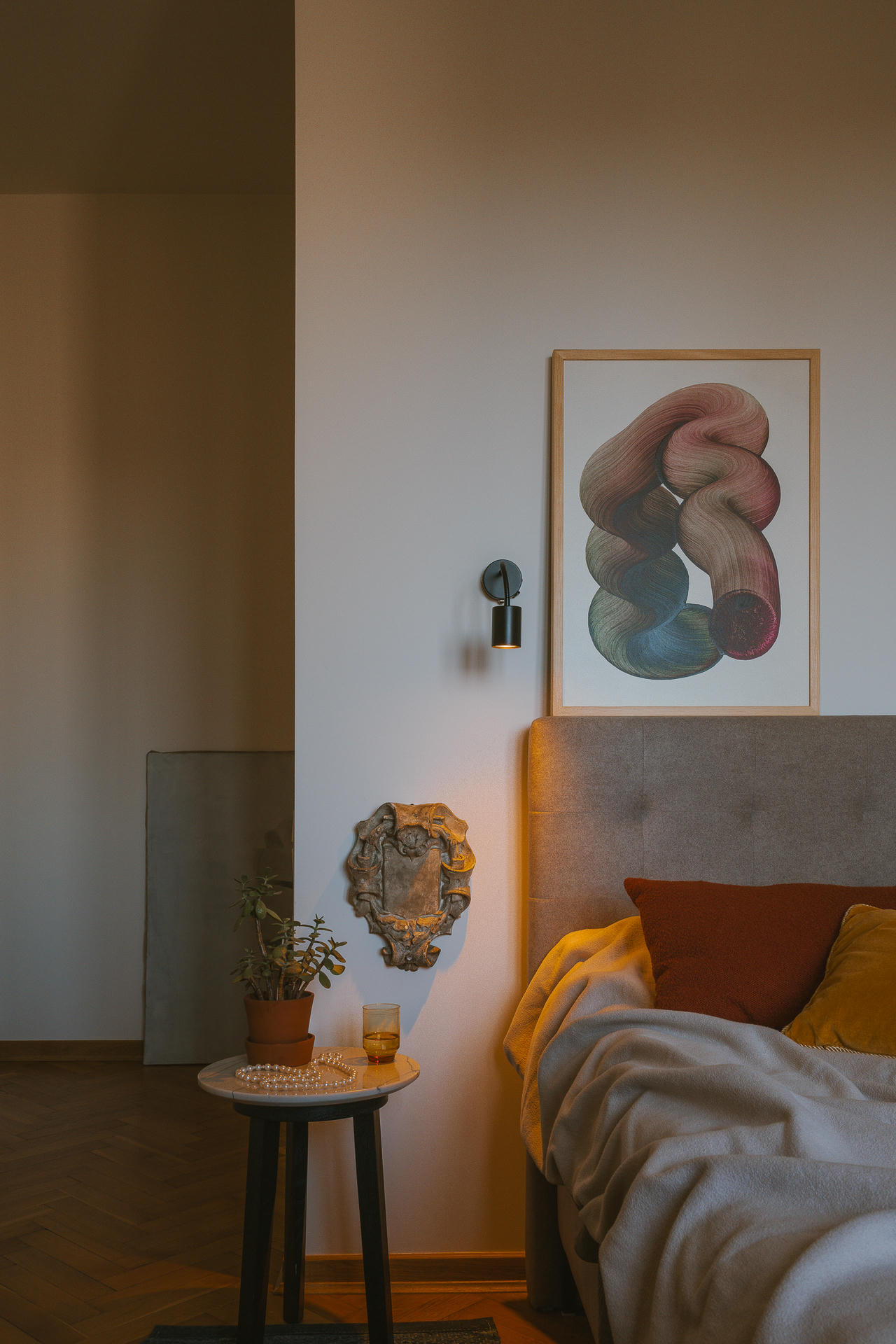 Za przeszklonymi drzwiami z miedzianymi okuciami kryje się strefa prywatna. Sypialnia i przechodnia garderoba utrzymane są w minimalistycznym duchu. Ich oszczędny charakter przełamują pojedyncze, wyraziste akcenty – obraz Nikodema Szpunara oraz stolik Lea autorstwa architektki Ewy Lewandowskiej.