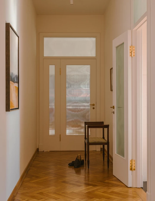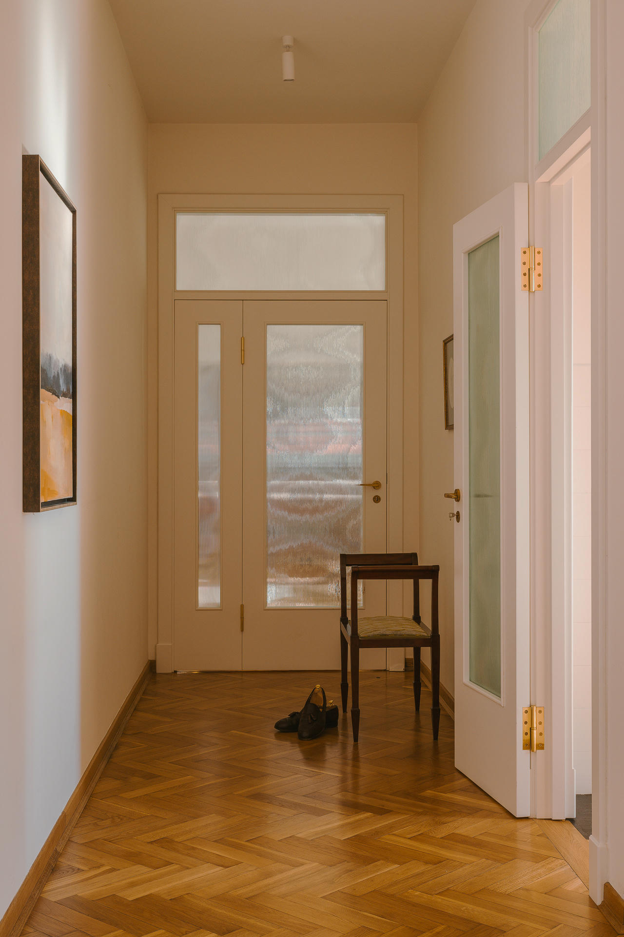Wyburzenie części ścian działowych pozwoliło stworzyć współczesny układ – otwartą i jasną część dzienną oraz prywatną przestrzeń z sypialnią, łazienką i garderobą. Osią mieszkania jest korytarz, który rozpoczyna się w hallu wejściowym i – poprzez oryginalne przeszklone drzwi – otwiera perspektywę.