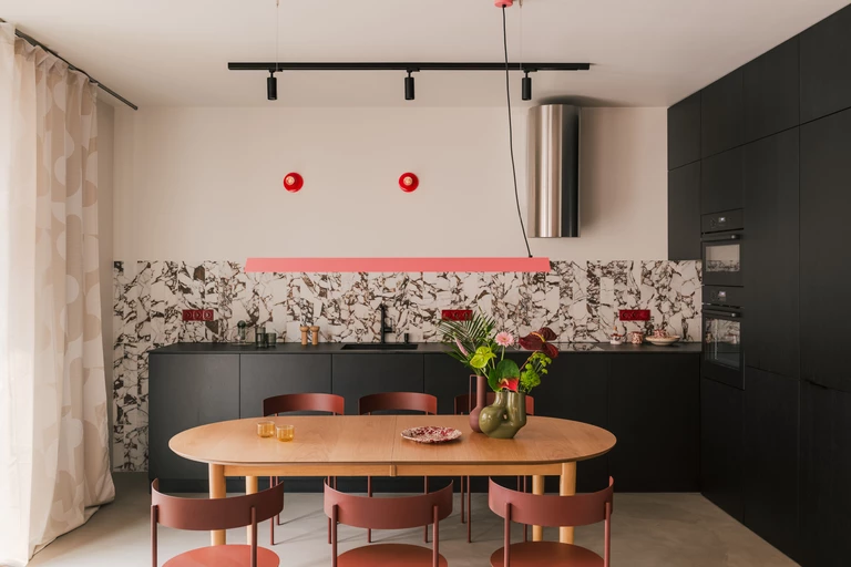 W kuchni zrezygnowano z szafek nad blatem, a przechowywanie i wszystkie potrzebne sprzęty kuchenne (w tym lodówkę, miejsce na wino, wysuwany termomiks, piekarnik i mikrofalówkę) udało się zmieścić w wysokiej zabudowie bocznej. Jej górny pas kryje dodatkowo wentylację budynku oraz klimatyzację. Blokowa, czarna zabudowa kuchenna stanowi dobre tło dla marmurowych płytek włoskiej marki 41zero42 oraz wyrazistych intensywnie czerwonych akcentów w postaci połyskujących włączników z serii GIRA S-Color i prostych kinkietów. Kolorystyczną „kropką nad i” jest podłużna różowa lampa Misalliance Ex polskiej marki Lexavala, której geometryczna forma kontrastuje z obłościami stołu oraz krzeseł.