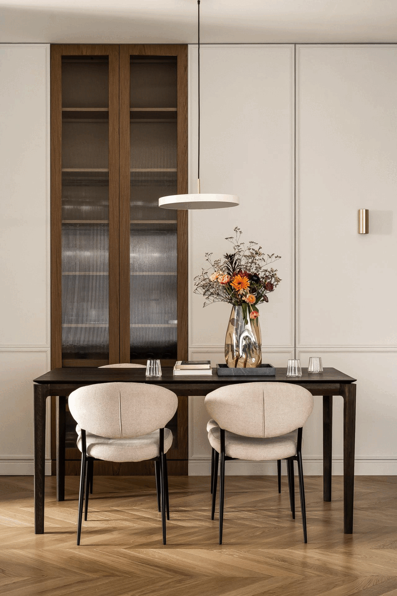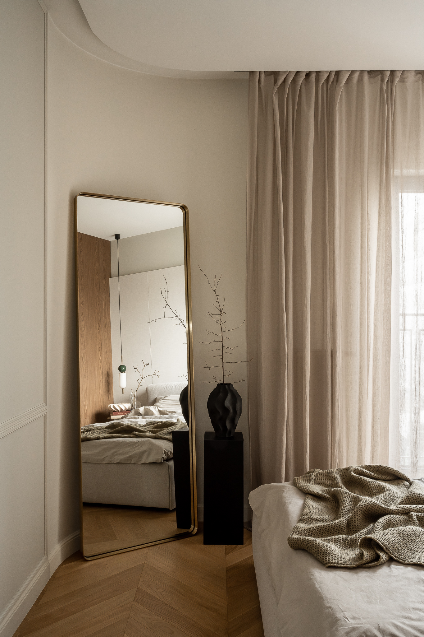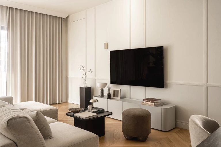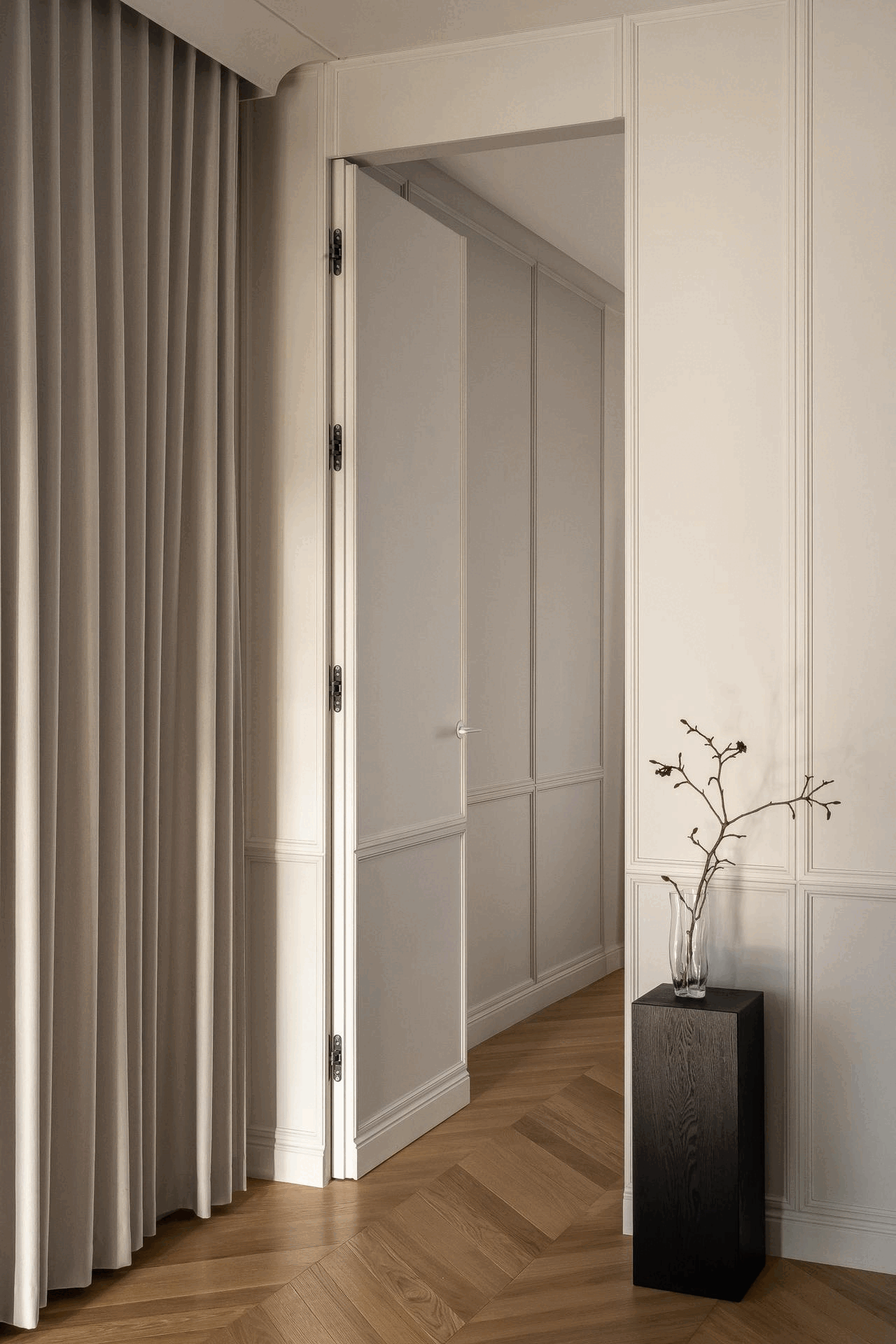Motywem przewodnim stała się architektoniczna iluzja. Już od progu ma się wrażenie, że przestrzeń skrywa więcej, niż ujawnia. Klasyczna sztukateria, zamiast być jedynie dekoracją, staje się kluczowym elementem gry z percepcją. Pionowo-poziome podziały ścian, wyznaczone przez eleganckie ramy, kryją w sobie przejścia do pozostałych pomieszczeń. Drzwi zlicowane z płaszczyzną muru stają się niewidoczne, a cała kompozycja nabiera monolitycznego charakteru.