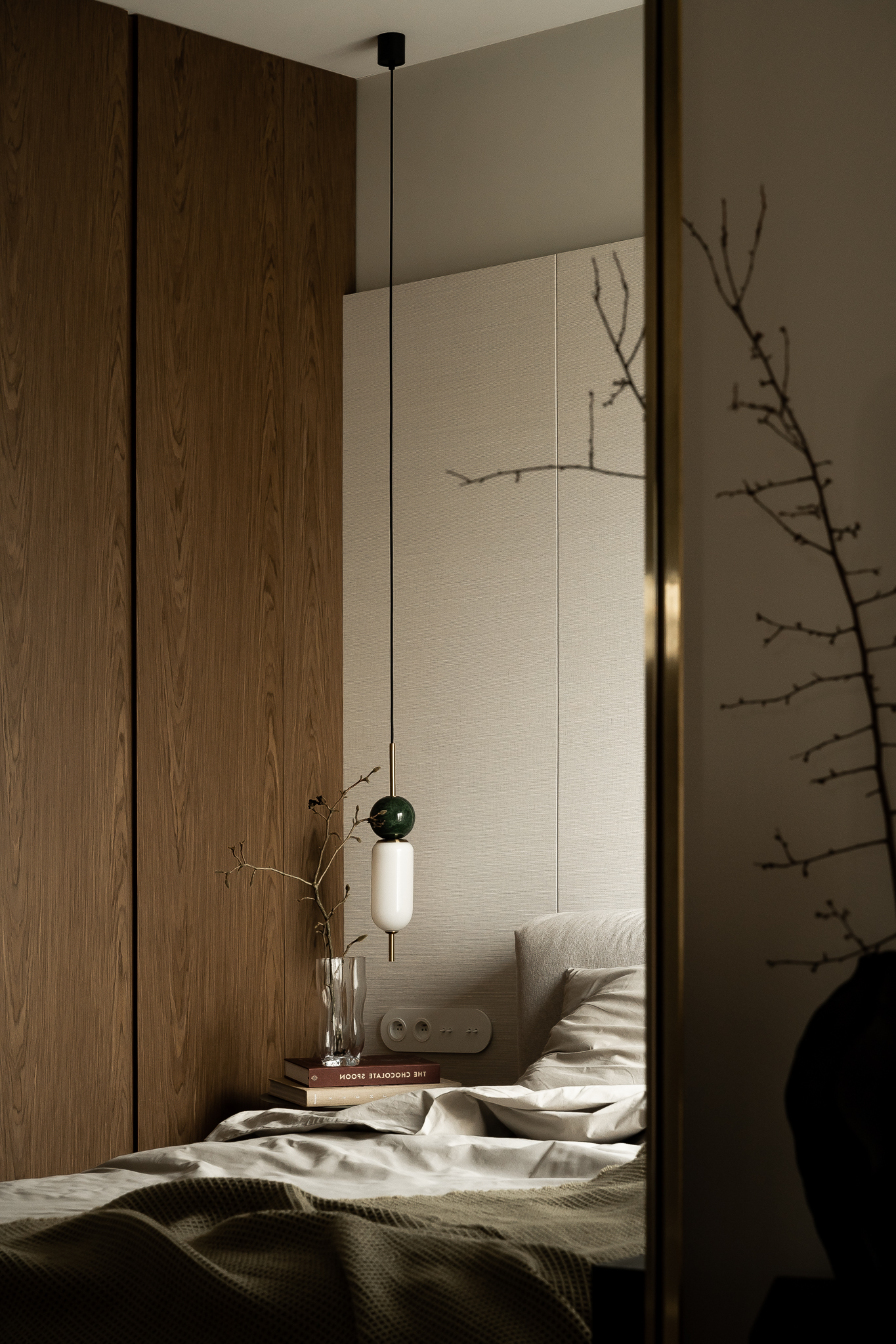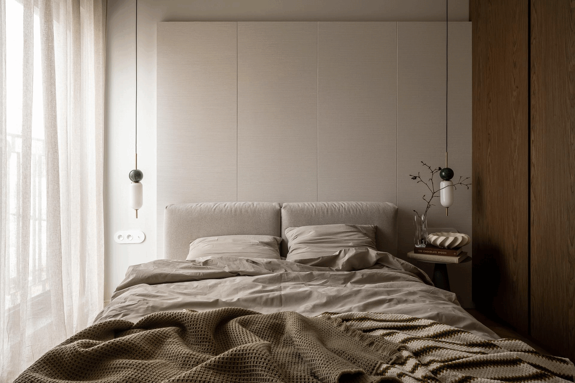 Paleta estetyczna projektu opiera się na naturalnych materiałach i subtelnych różnicach w teksturach. Neutralne barwy stanowią tło dla gry światła na powierzchniach kamienia, drewna i tkanin. Wyciszenie wizualne znajduje swoje dopełnienie w sferze akustyki. Sypialnia, będąca oazą spokoju, została odizolowana matami akustycznymi. To gest, który podkreśla, że luksus to także komfort i prawo do własnej ciszy. Jej aranżację definiuje tapetowany zagłówek, który wizualnie kotwiczy strefę wypoczynku, oraz ozdobne lampy, tworzące miękką, niemal teatralną scenografię.