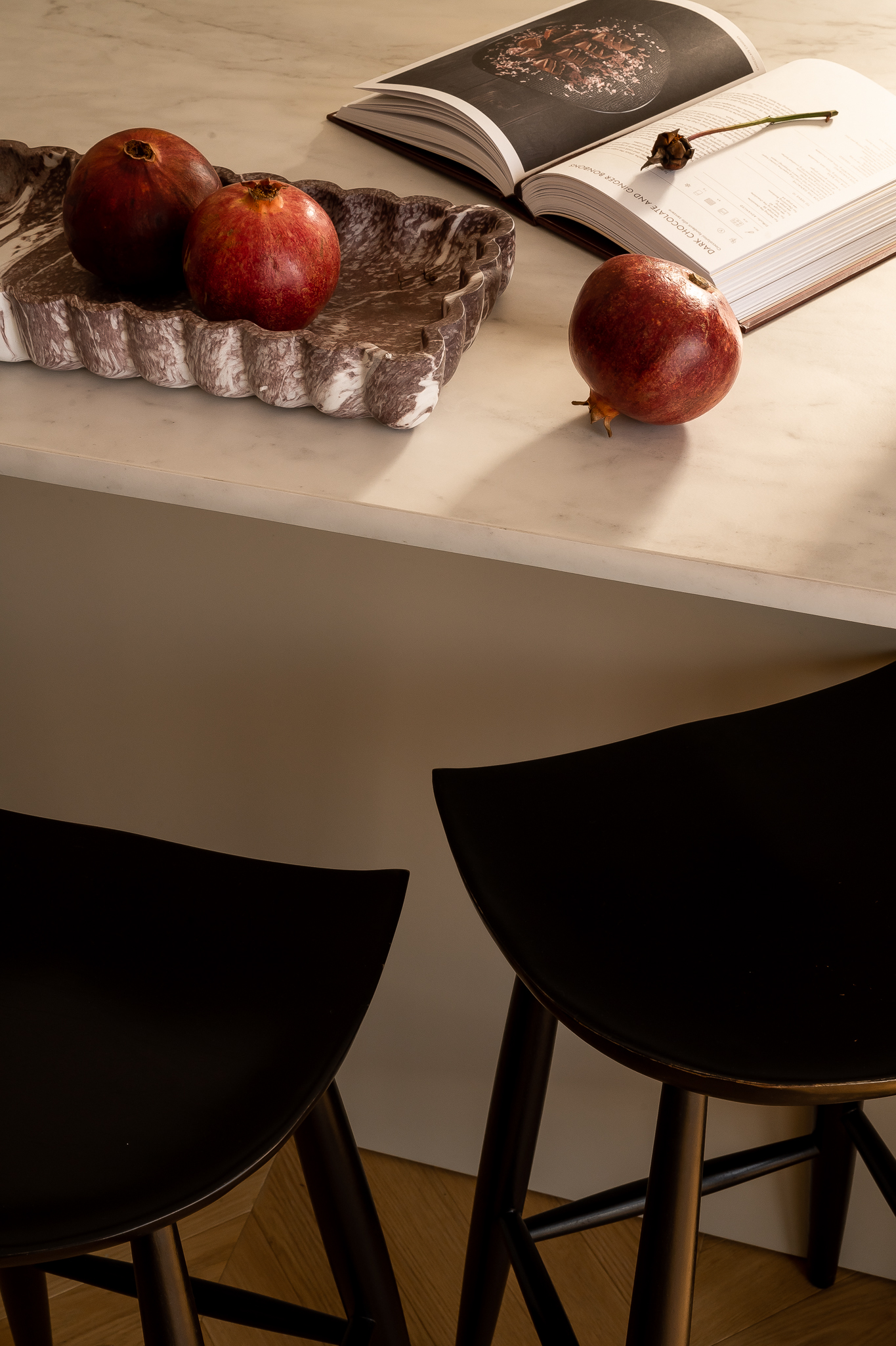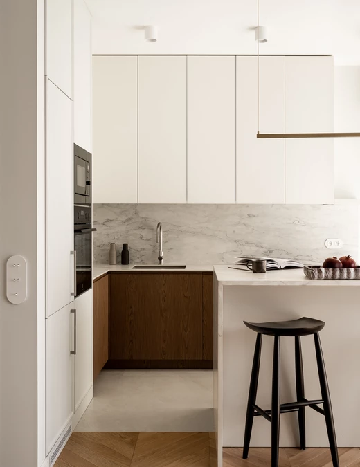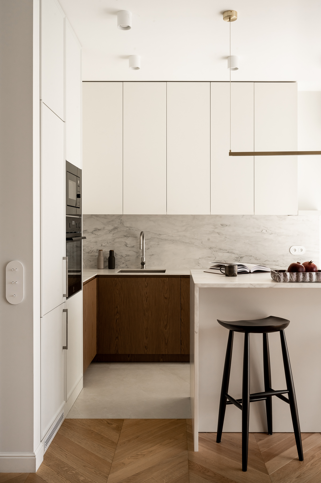 Ta sama zasada dyskrecji rządzi w całym apartamencie. Ściany płynnie przechodzą we fronty szaf i schowków, zacierając granicę między architekturą a meblem. Kuchnia, choć stanowi część otwartego planu, została dyskretnie zlokalizowana w aneksie, oddzielona od wejścia ścianą z garderobą, a od salonu – monolityczną wyspą z naturalnego kamienia. Pełni ona rolę szlachetnego buforu, który porządkuje przestrzeń i zapewnia poczucie prywatności.