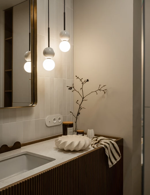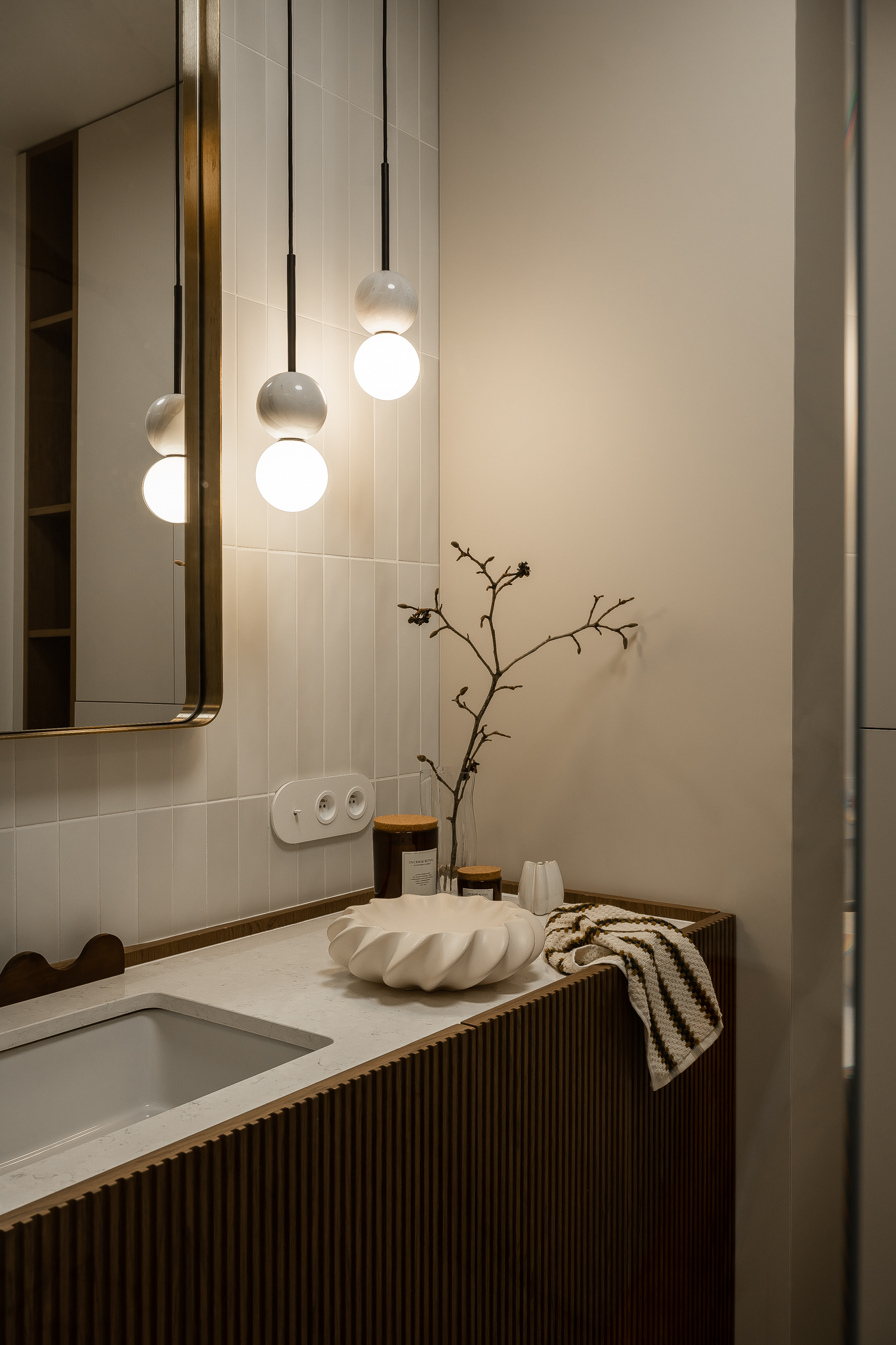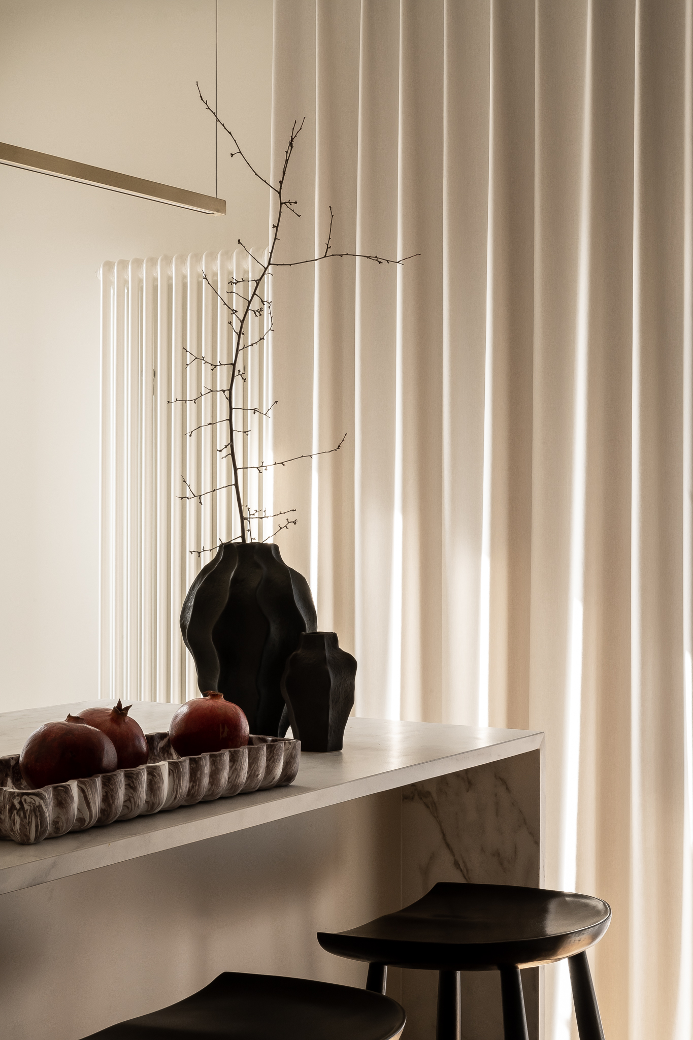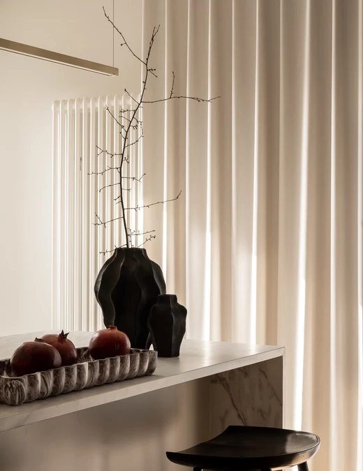 W kulturze japońskiej istnieje pojęcie ma – oznaczające pustą, negatywną przestrzeń, która jest równie ważna jak obiekty ją wypełniające. Ten apartament jest tego doskonałym przykładem. To, czego nie widać, definiuje jego charakter na równi z tym, co pozostaje w zasięgu wzroku, tworząc przestrzeń dojrzałą, spokojną i ponadczasową.