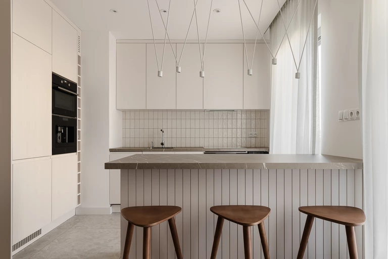 Oświetlenie jest dla właścicielki lokalu jednym z najważniejszych elementów wnętrza, z tego względu w mieszkaniu znalazło się wiele pięknych i unikatowych lamp – w tym kultowych marek, takich jak Vibia, Brookis czy Flos. Każda z nich skupia uwagę i podkreśla wybrane strefy wnętrza, takie jak wyspa czy zaprojektowany w pracowni okrągły, dębowy stół. Dekoracyjne oświetlenie uzupełniają wbudowane w sufit podwieszany proste oprawy świetlne i oświetlenie led.