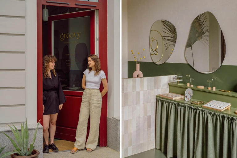 Groovy tworzą Dorota Kotwica oraz Joanna Mach, duet projektantek biżuterii. Każda kolekcja ich marki jest wynikiem inspiracji wybranym utworem muzycznym i często nawiązuje do klimatu retro. Razem z architektką Joanną Stolarek z LUVA architecture zaprojektowały wnętrze swojego wymarzonego butiku w Łodzi. Oprócz strefy sklepowej znalazł się tu warsztat, w którym dziewczyny na co dzień wykonują biżuterię.