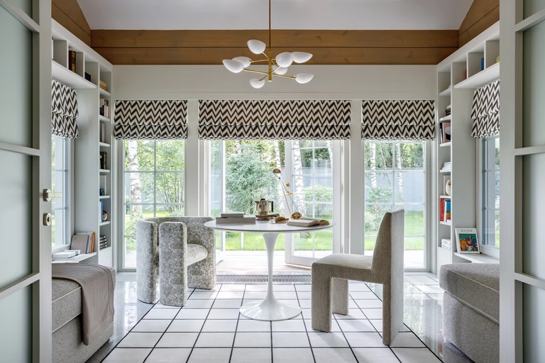 Ta wiejska posiadłość została zaprojektowana przez rosyjską architektkę Olgę Malyevą. We wnętrzu willi postawiono na naturalną paletę barw i prostotę, dzięki czemu można poczuć się tam jak w wakacyjnym domu. Starannie zaprojektowana przestrzeń obejmuje strefę domowników oraz część gościnną – oddalone od centrum domu sypialnie, tylne drzwi oraz druga kuchnia zapewniają prywatność zarówno właścicielom domu, jak i odwiedzającym je osobom.