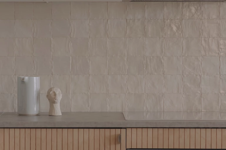 Natomiast dolne szafki to fornir naturalny z kolekcji Norwegian Wood. Wybór padł tutaj na brzozę skandynawską w modelu Stripe. Zastosowane na ścianie płytki pięknie odbijaj światło dzienne. W połączeniu z frontami nadają jej niepowtarzalny klimat.