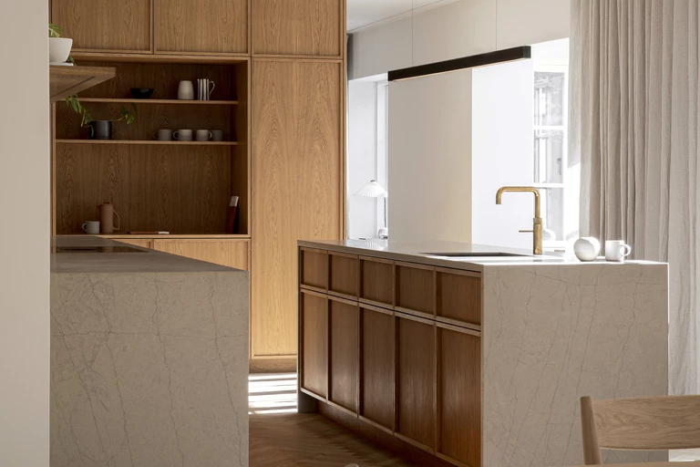 Znajdująca się nad blatem drewniana półka to idealne miejsce do wyeksponowania zbieranej przez gospodarzy porcelany. Drewniane półki znalazły się także w salonie. Wnętrze uzupełniono meblami z najnowszej kolekcji pracowni stworzonej dla Karimoku Case Study.