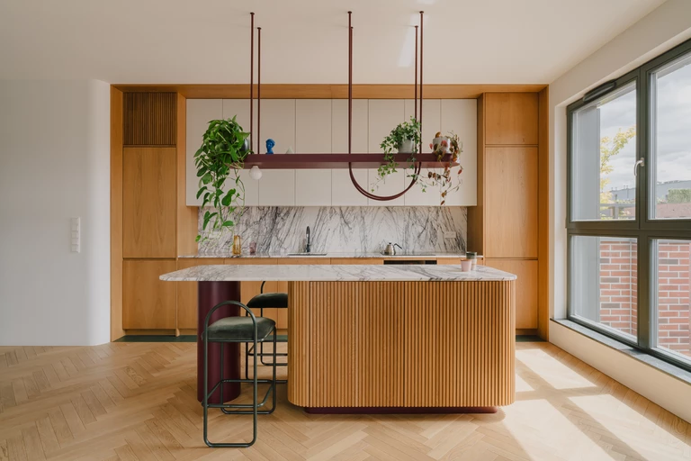 Tłem kompozycyjnym salonu oraz jednocześnie sercem mieszkania jest kuchnia z dużą wyspą kuchenną, nad którą podwieszono zaprojektowaną przez pracownię em2 bordową, stalowa lampę, stanowiącą jednocześnie półkę na kwiaty lub książki kucharskie. Fronty kuchni wykonano z delikatnie bejcowanego forniru dębowego, natomiast wyspę kuchenną, wspartą na bordowej nodze, zrobiono z litego drewna.