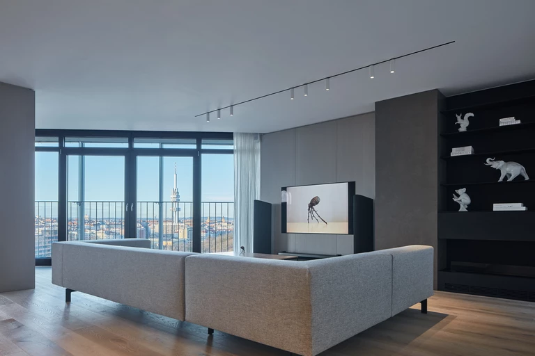 Mieszkanie znajduje się w Pradze, w kompleksie apartamentów będących dziełem studia A69 o międzynarodowej renomie. Z jego okien rozciąga się fantastyczny widok na panoramę miasta. Widać stąd m. in. wieżę telewizyjną Žižkov i Zamek Praski.