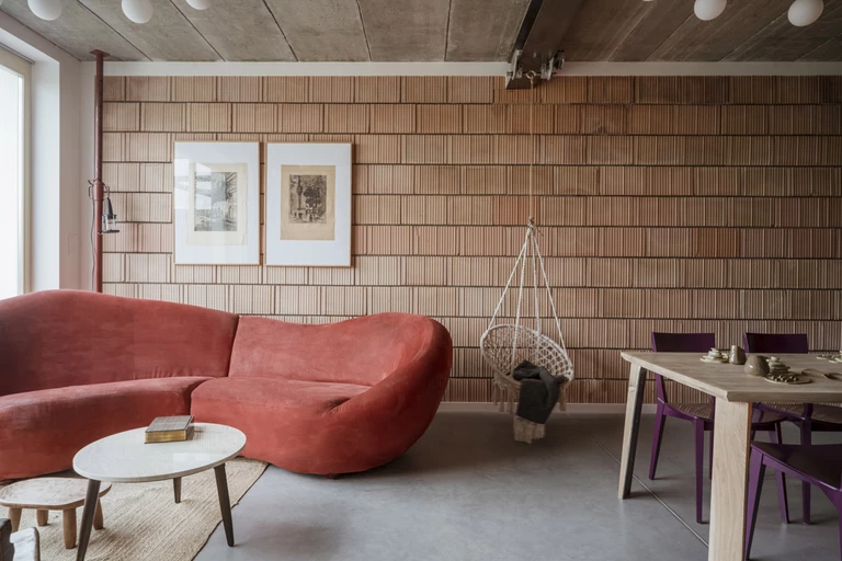 Zachowano beton polerowany na podłodze, odkryte płyty smart na suficie, stalowe podciągi w naturalnym wykończeniu oraz pustaki porotherm, które murowano z większą starannością niż gdyby miały być schowane pod tynkiem. Dzięki temu immanentne elementy budynku zostały wyeksponowane i nabrały walorów dekoracyjności.