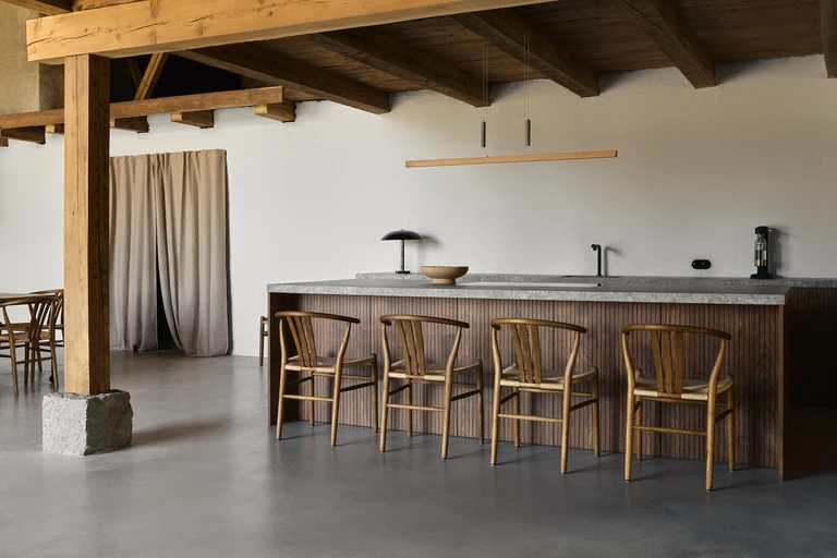 Kathrin i Bernhard chcieli, aby doświadczenie wspólnego przebywania i gotowania w kuchni było zarówno dla nich, jak i ich gości wyjątkowe. Dlatego właśnie umiejscowili ją centralnym punkcie budynku dawnej stajni. W projekcie kuchni zrezygnowano z górnych szafek, dzięki czemu powstała nieprzytłaczająca wielkością zabudowa, mimo swojego dużego rozmiaru. Korpusy szafek wykonane przez miejscowego rzemieślnika zostały uzupełnione o naturalnie fornirowane fronty w kolorze orzecha amerykańskiego z oferty polskiej marki FRØPT. Na blat wybrali spiek kwarcowy.