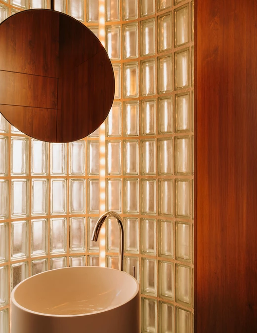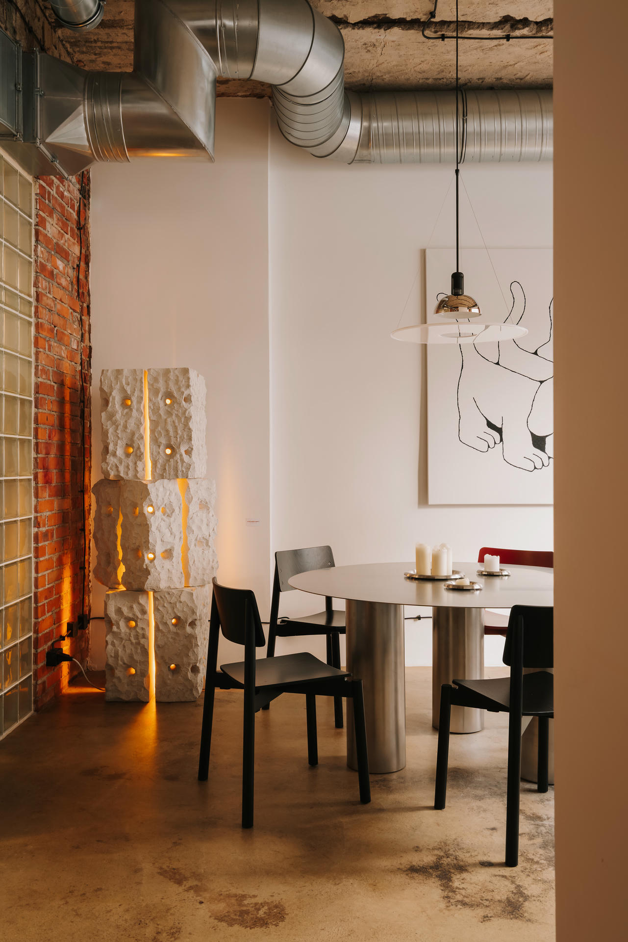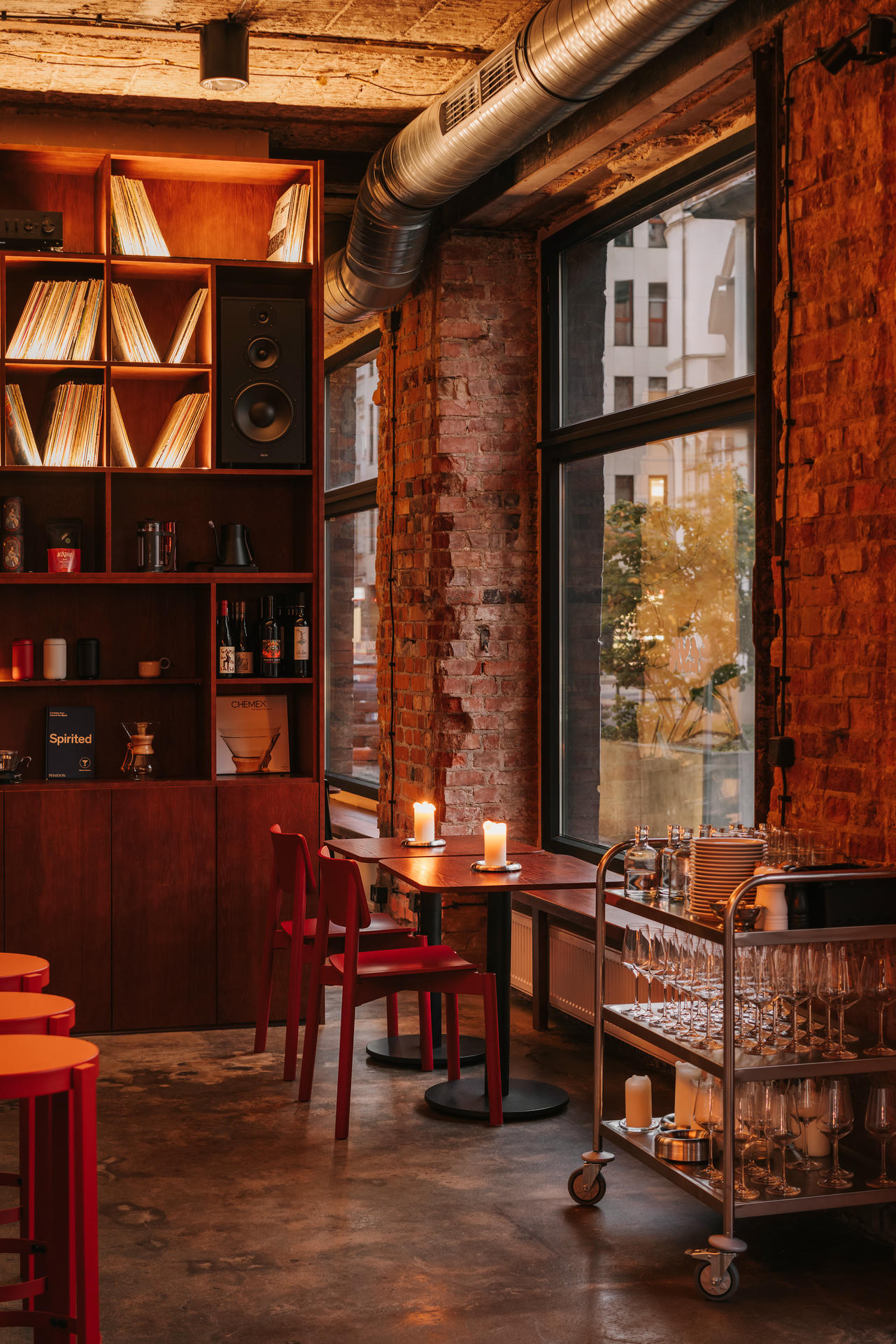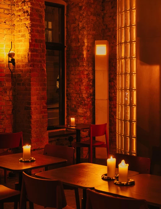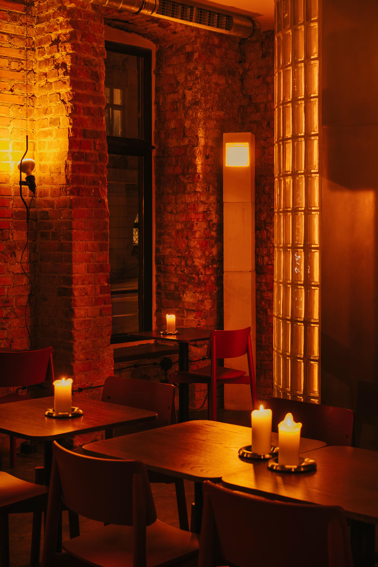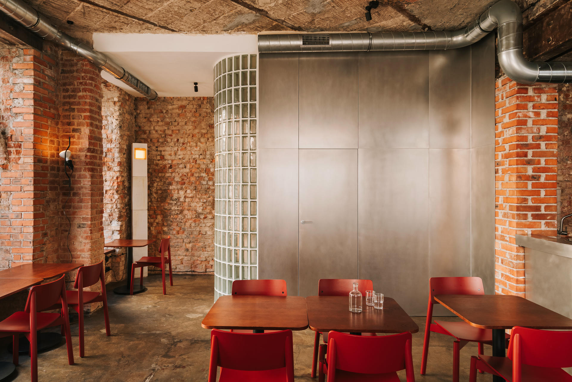 Lokal o powierzchni 130 m² powstał z głębokiego szacunku do istniejącej przestrzeni – surowego, industrialnego wnętrza z oryginalną cegłą, ponadstuletnimi stalowymi elementami konstrukcyjnymi i betonową posadzką. Nowe ingerencje architektoniczne nie konkurują tu z zastanym kontekstem, lecz subtelnie go dopełniają.