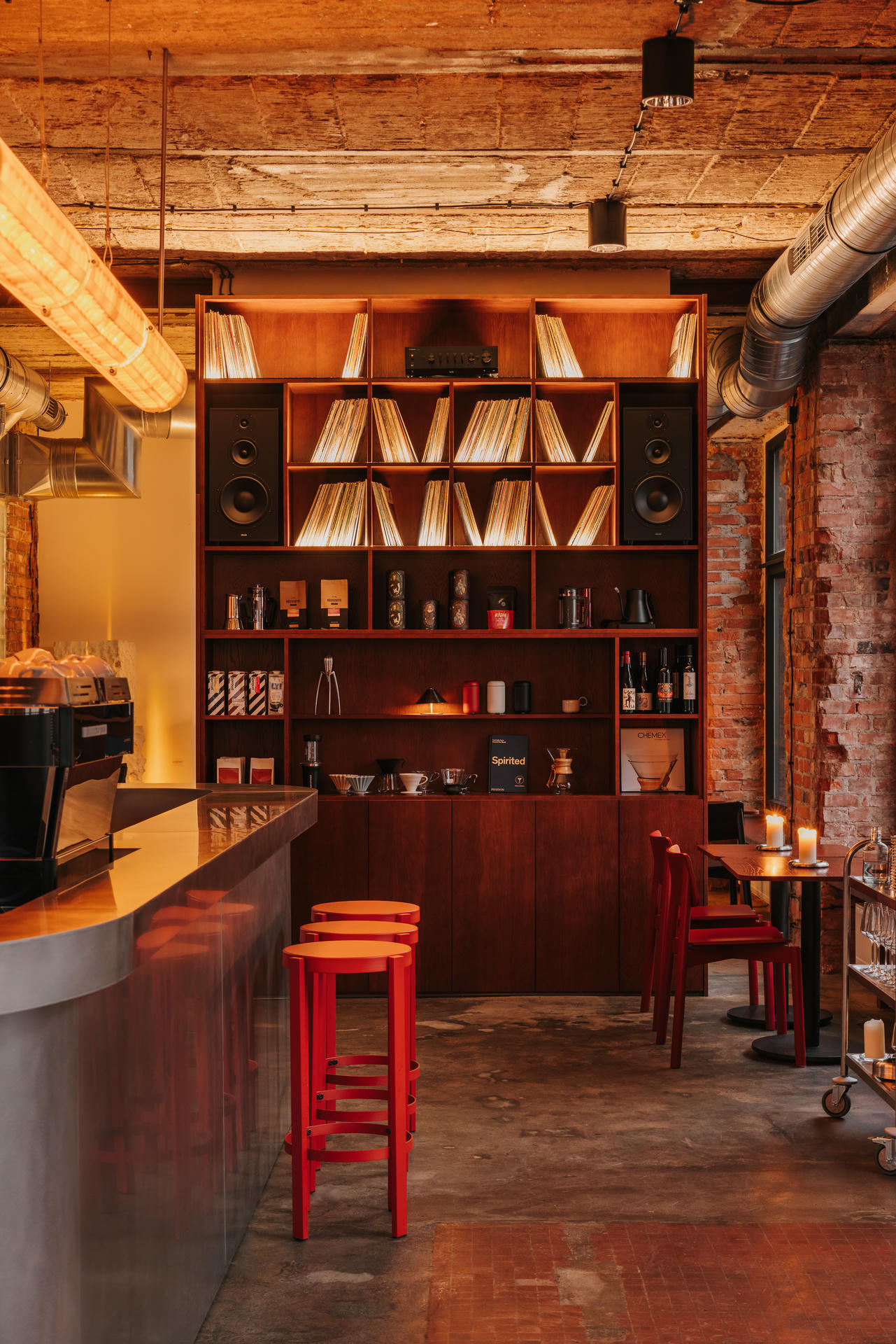 Nad barem zawisła autorska lampa zaprojektowana i wykonana przez Dérive Studio, podkreślająca industrialny charakter lokalu.