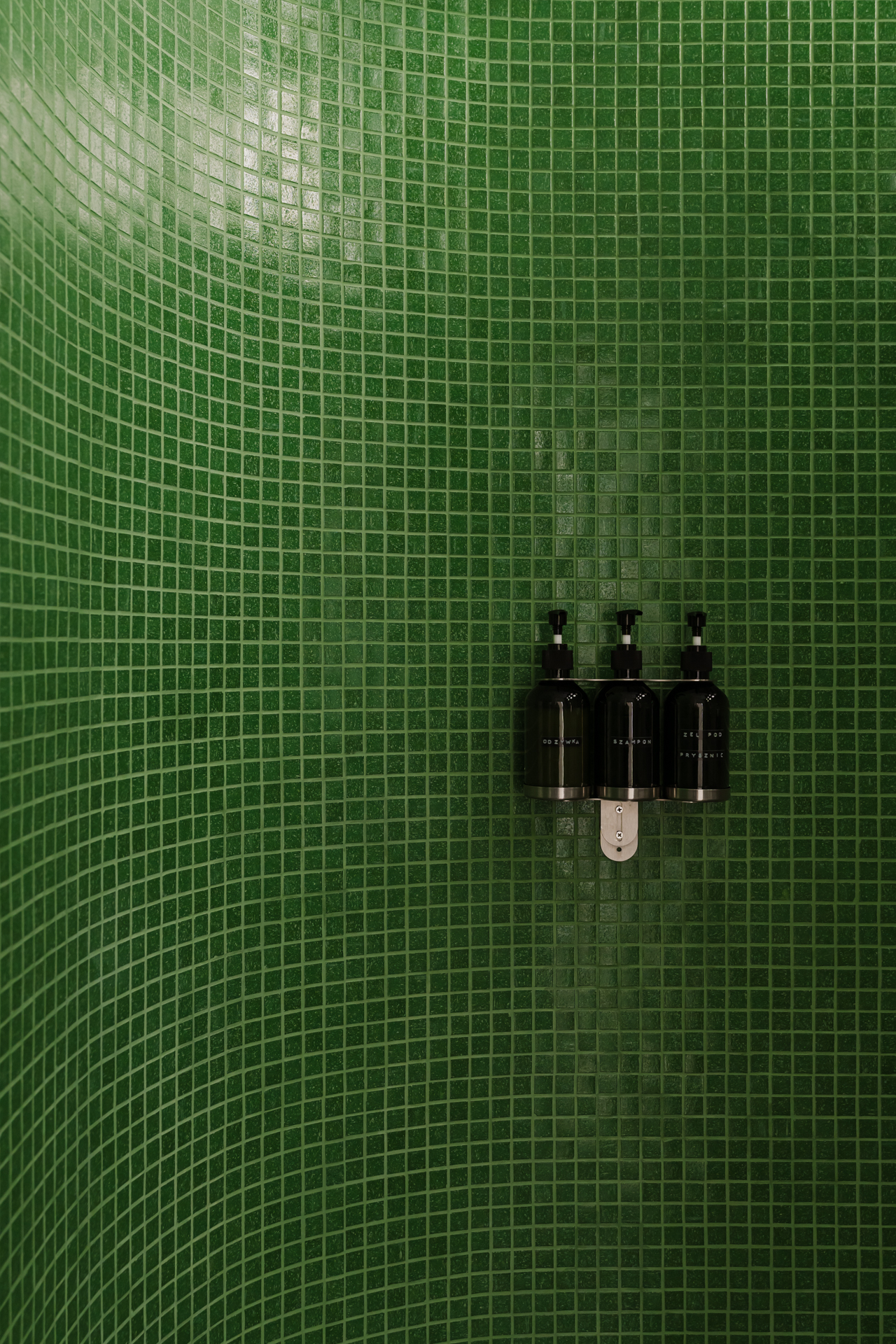 Umywalka została osadzona na ręcznie wykonanej szafce, nad którą zawisła stara żeliwna lampa i trójkątne lustro w spawanej stalowej ramie. Również drzwi do łazienki wykonano specjalnie na potrzeby projektu; trawiona, półprzezroczysta szyba podkreśla charakter wnętrza.