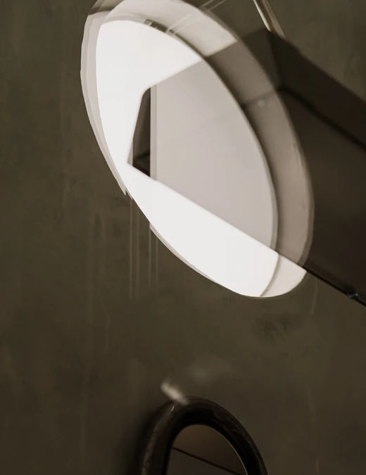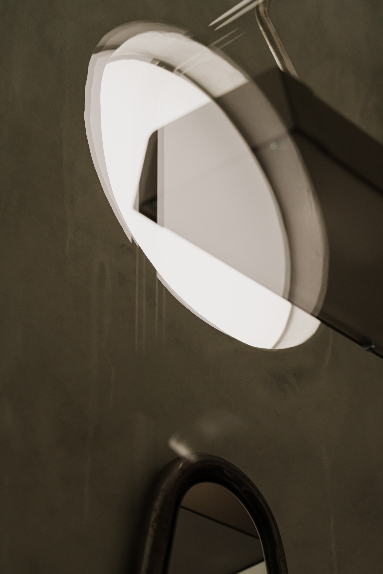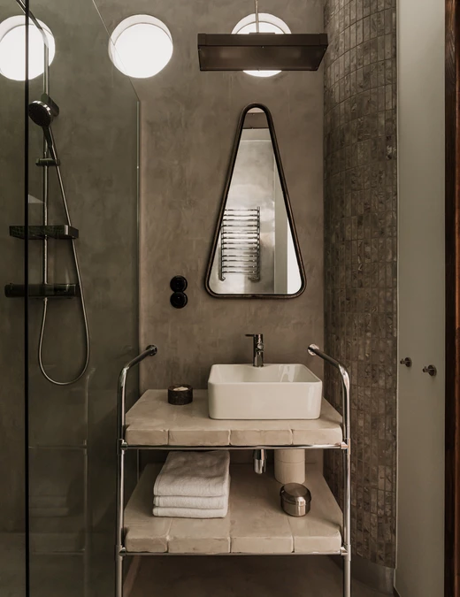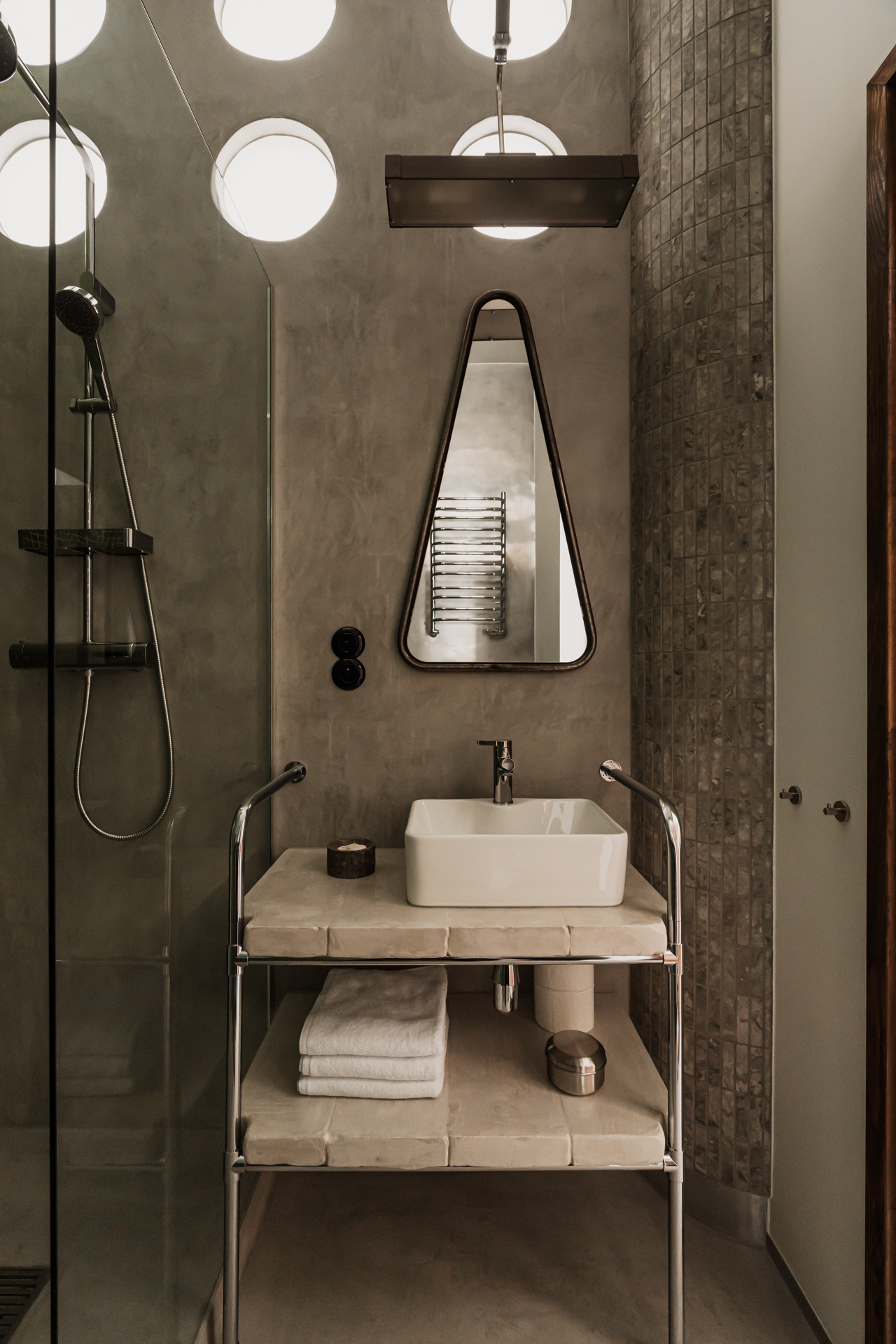 Łazienka kontynuuje wizualne założenia mieszkania – bez stylistycznych kompromisów. Pojawiają się tu strzeliste formy, surowe akcenty i monochromatyczna, falująca ściana. Ilość płytek ceramicznych ograniczono do minimum, a na ścianach pojawiły się blachy oraz betonowe tynki.