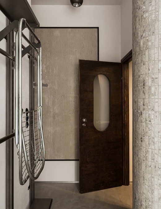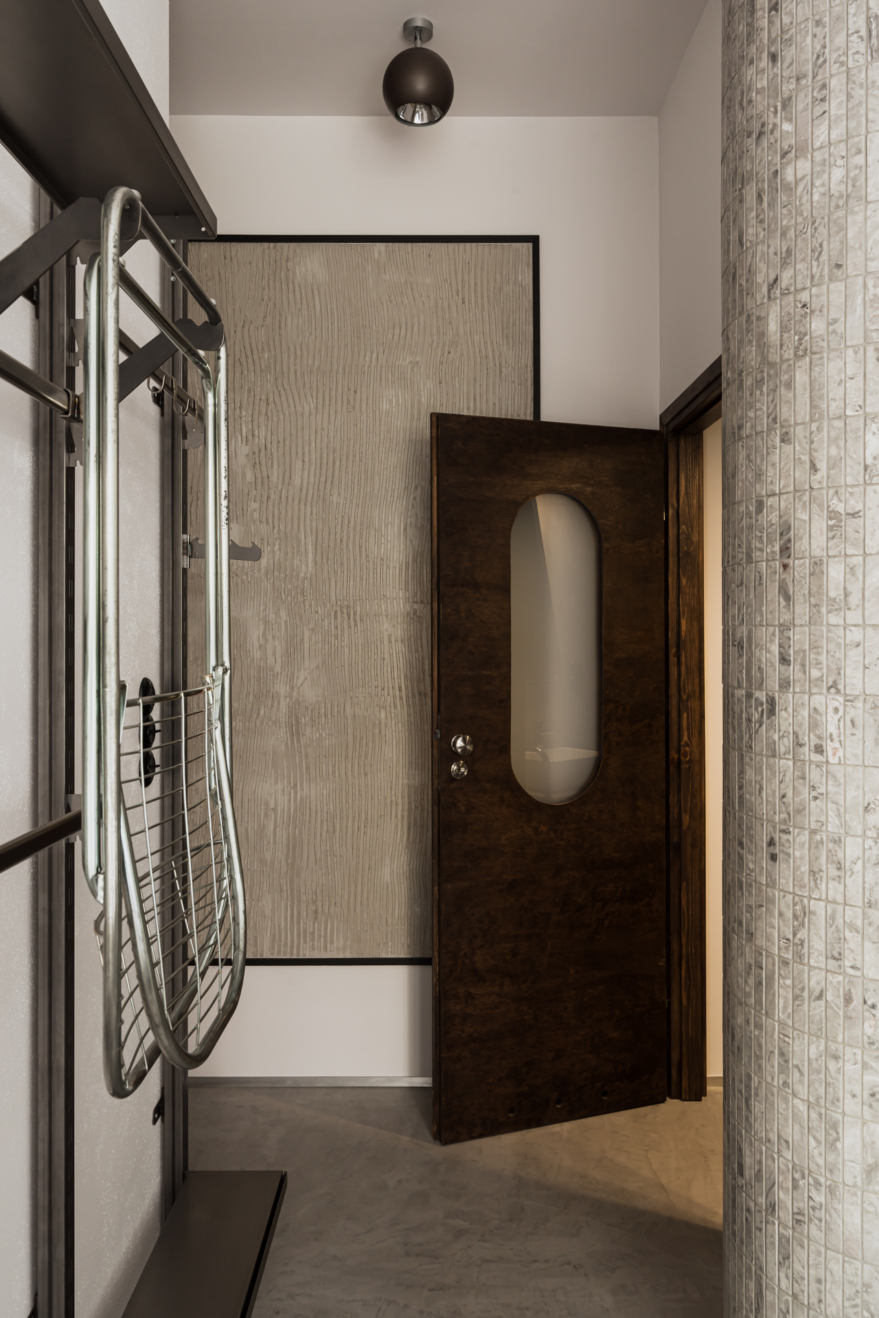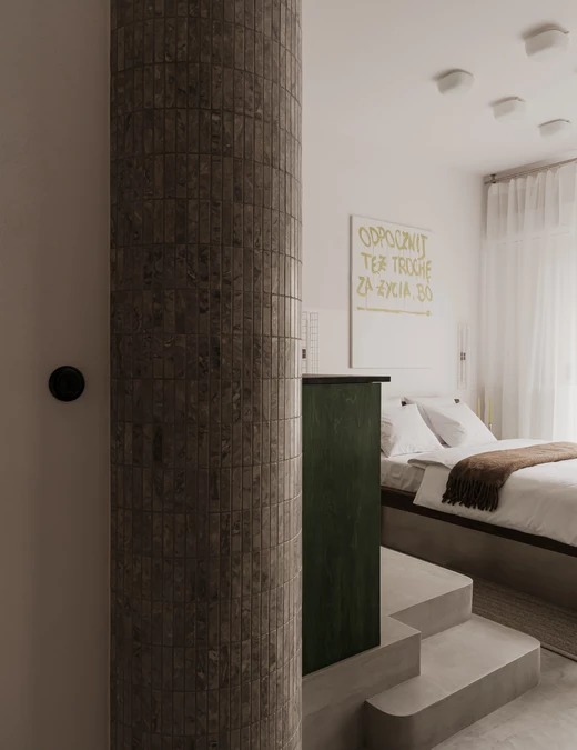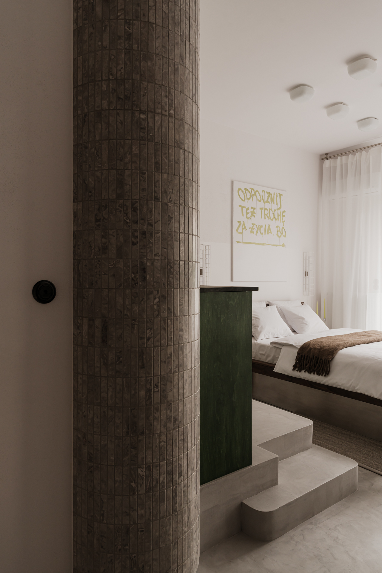 W tym wnętrzu projektanci postawili na surową formę, zachowując jednak ostrożność, by wnętrze – mimo inspiracji brutalizmem – pozostało przytulne i komfortowe w odbiorze. Zamiast dosłownych cytatów z estetyki industrialnej pojawiają się tu charakterystyczne formy, których użyto do wydzielenia przestrzeni. Mowa między innymi o okrągłych okienkach w ścianie działowej, które pozwoliły doświetlić zamkniętą łazienkę, czy o podeście oddzielającym aneks kuchenny od reszty wnętrza. Takie rozwiązanie pozwoliło zrezygnować z klasycznej przegrody.