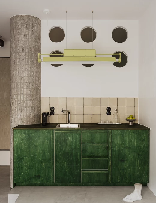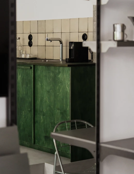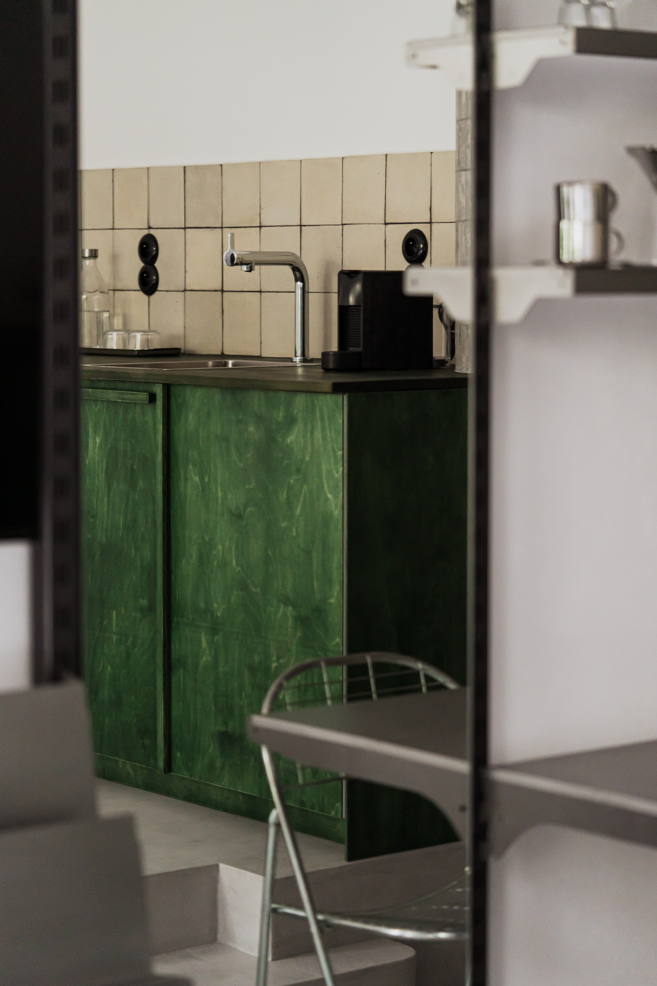 Kuchnia, ze względu na ograniczoną przestrzeń i komercyjny charakter, została zamknięta w formie aneksu. Z myślą o wielofunkcyjności płytę grzewczą ukryto w wysuwanej szufladzie. Pralkę – niemożliwą do zmieszczenia w łazience – również ulokowano w aneksie, podobnie jak podblatową lodówkę. Nad blatem pojawiły się grube cementowe kafle pochodzące z poniemieckiej kamienicy w Świdnicy oraz odrestaurowana lampa z MSI „Gwarancja” Olsztyn.