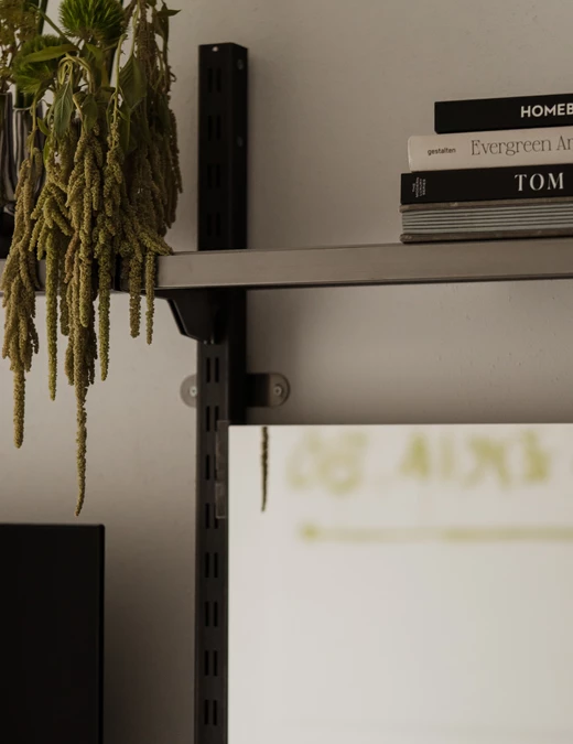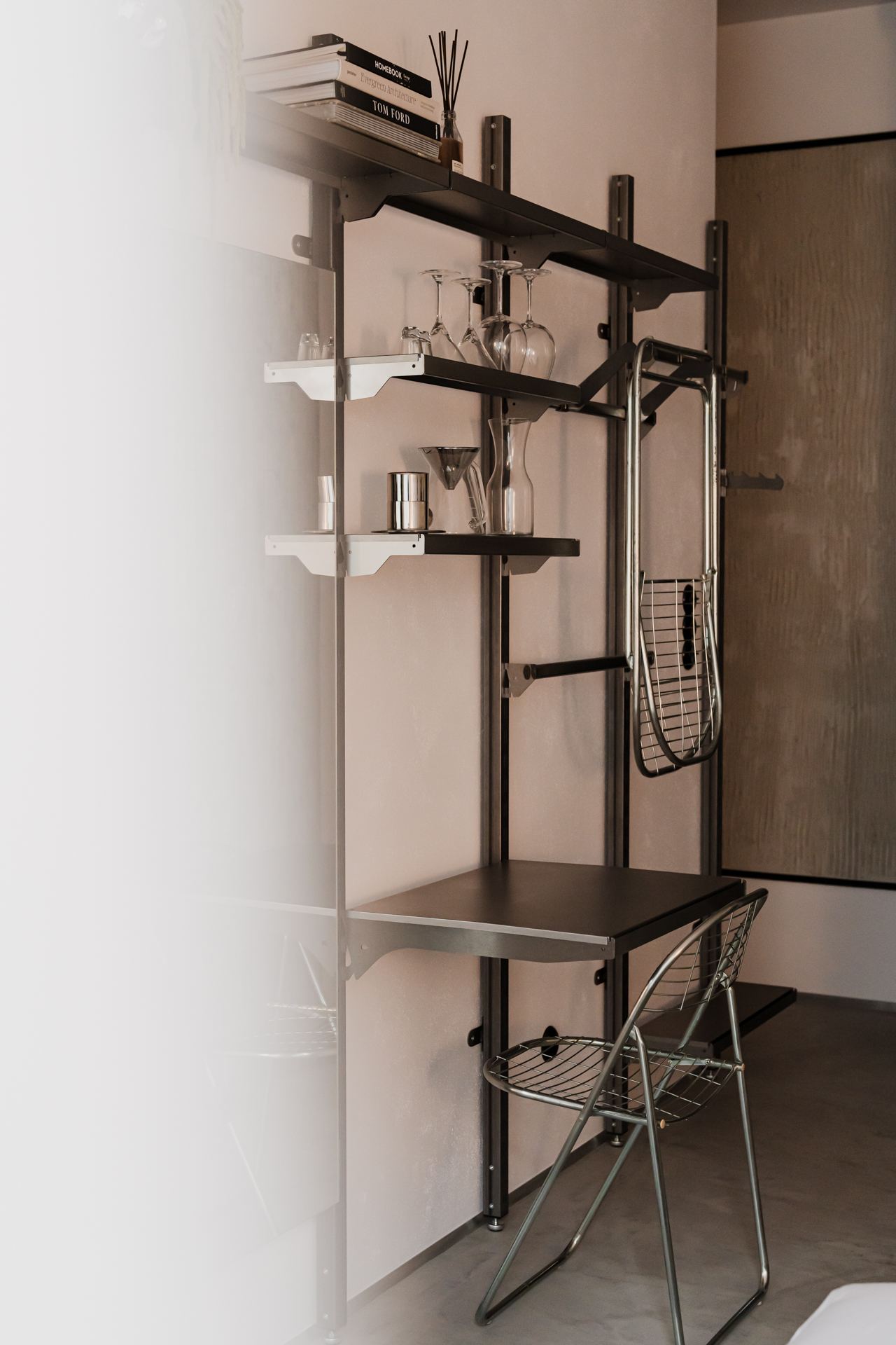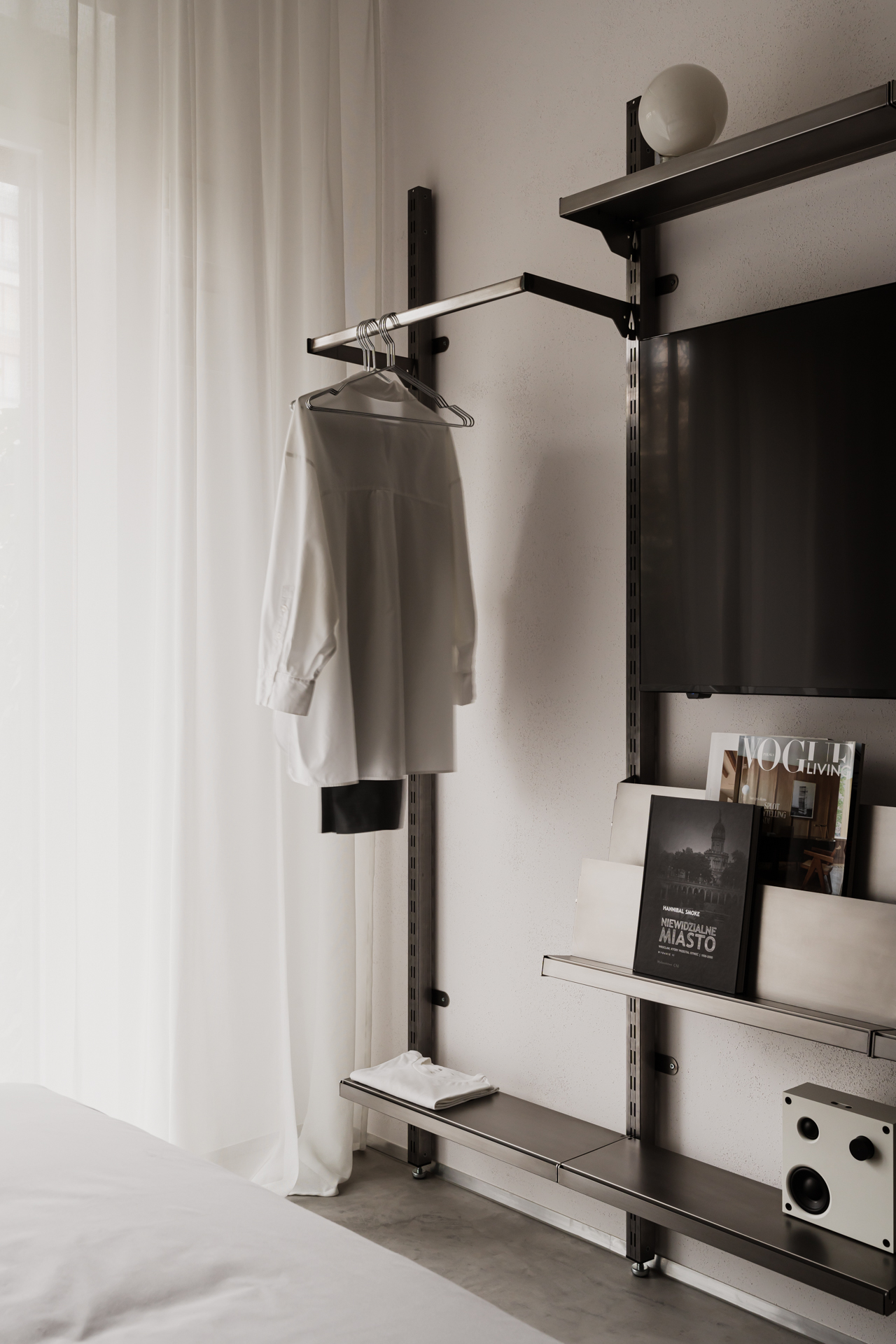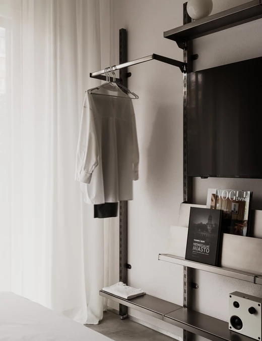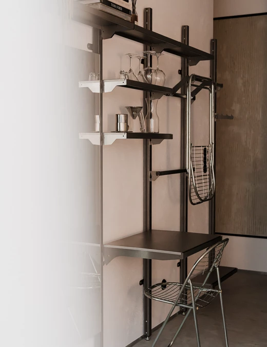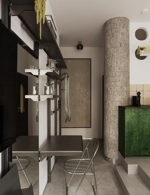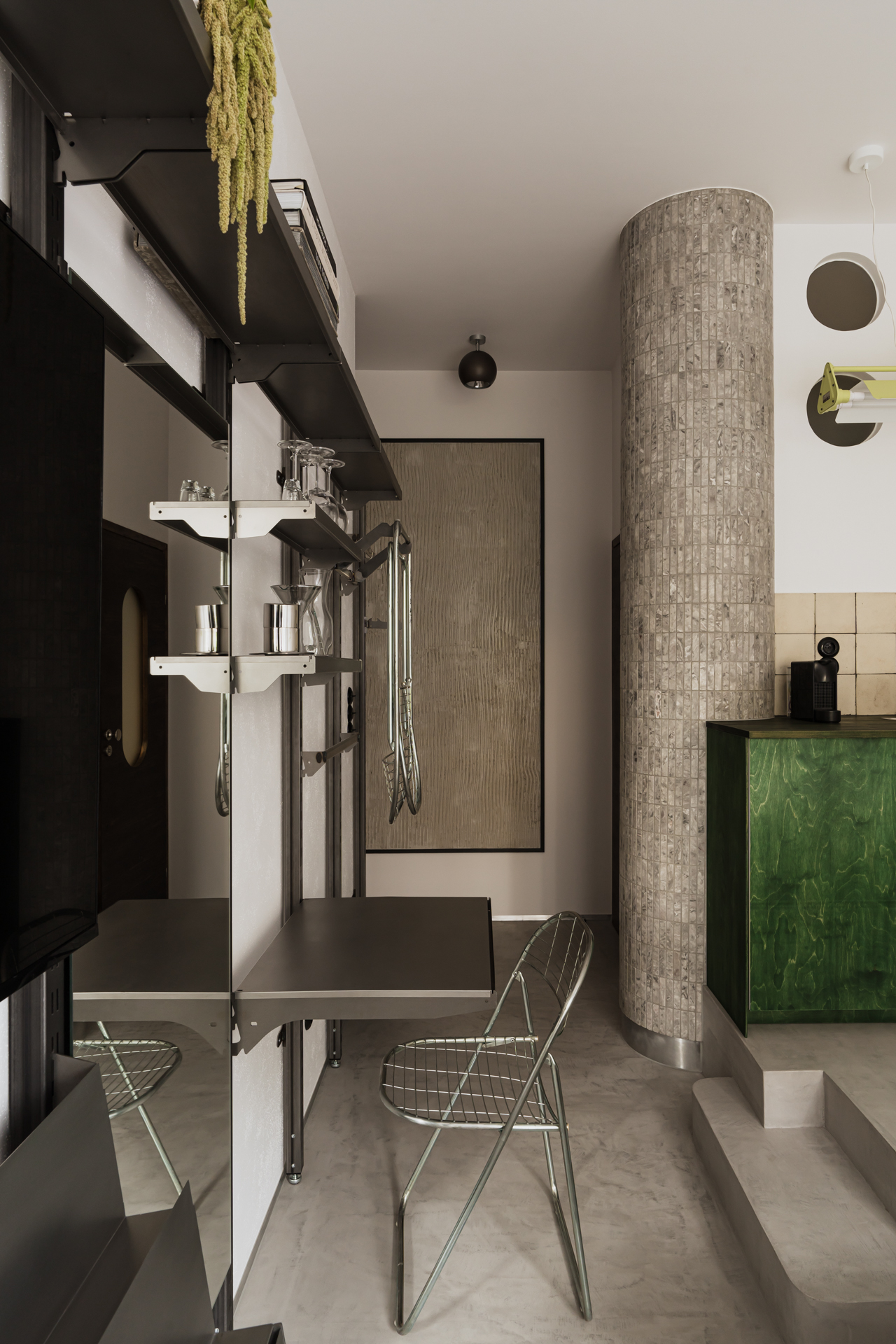 Aby zmieścić pozostałe niezbędne meble i jednocześnie nie zagracić niewielkiej powierzchni, zaprojektowano wielofunkcyjną zabudowę. W ten sposób powstała hybryda nawiązująca do charakteru PRL-owskiej meblościanki. „Dzięki jej multifunkcjonalności udało nam się, przy pomocy jednego dodatkowego elementu, odhaczyć na liście rzeczy niezbędnych: szafę, dużą ilość półek, stolik, lustro oraz wieszak na okrycia wierzchnie i buty”. Dla oszczędności miejsca zastosowano składane krzesła projektu Nielsa Gammelgaarda dla IKEA.