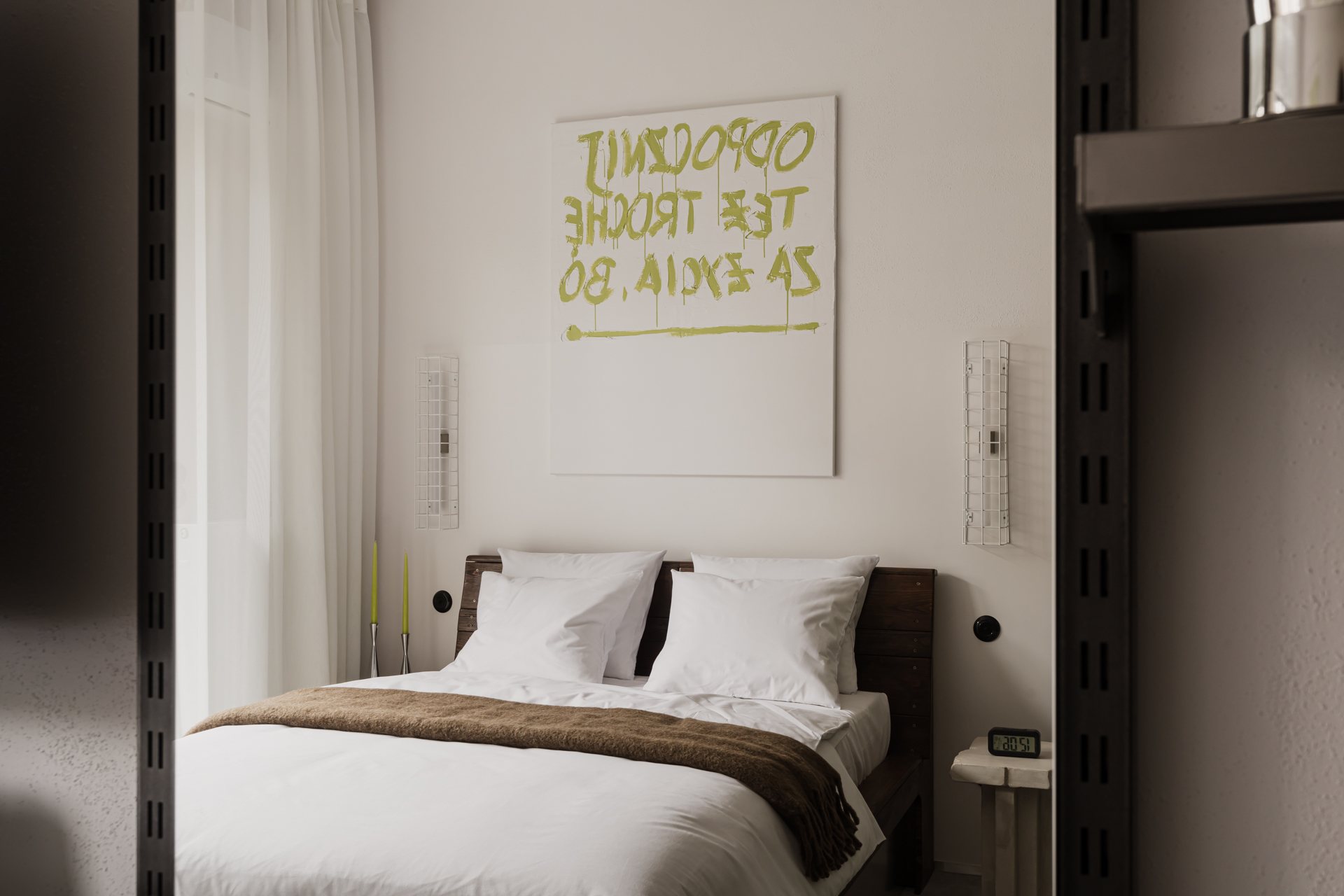 Mimo ograniczonego metrażu w sypialni stanęło duże, wygodne łóżko. „Dobry, niezakłócony sen jest dla nas wyznacznikiem udanego wypoczynku” – podkreślają autorzy. Wiedząc, że łóżko stanie się głównym punktem tej strefy, pomyślano je jako rodzaj rzeźby: skonstruowaną z odzyskanych desek paletowych, rozbudowaną drewnianą formę zwieńczoną błyszczącą stalą. Tuż obok pojawiły się stoliki z betonowych bloczków, a podłużne lampy zamknięto w metalowych klatkach.